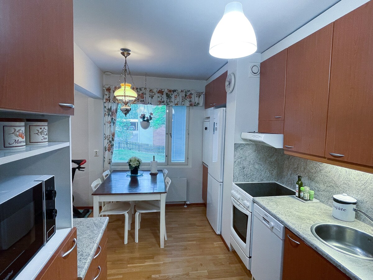 Căn hộ tuyệt đẹp ở một vị trí tuyệt vời! Căn hộ một phòng ngủ này có ban công tráng men, sân thượng lớn, phòng xông hơi khô và bãi đỗ xe nằm ngay trung tâm Kuopio. Chợ Kuopio cách đó khoảng 200 mét. Nhận phòng linh hoạt (hộp chìa khóa) cho phép bạn đến khi phù hợp với mình. Căn hộ được trang bị tốt. Bạn được sử dụng một loạt các dụng cụ nhà bếp và các thiết bị chất lượng cao. Tôi cũng đã cung cấp cho bạn đồ vệ sinh cá nhân và khăn trải giường và khăn tắm sạch, màu trắng. Chào mừng bạn đến với tư cách là khách của chúng tôi
