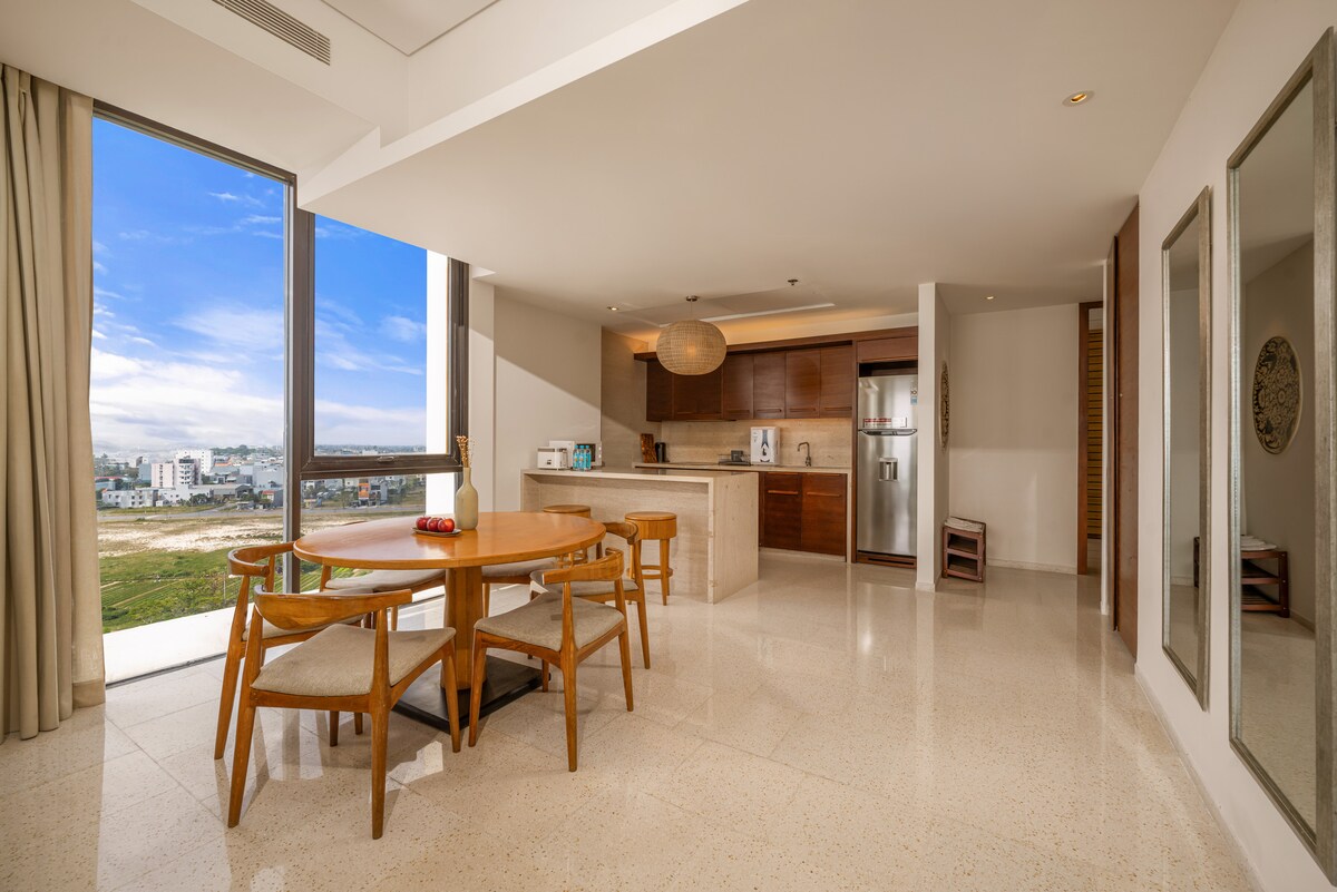 Thưởng thức một kỳ nghỉ ven biển cao cấp trong căn hộ tầng cao 130 m² của chúng tôi tại một trong những khu nghỉ dưỡng 5 sao uy tín nhất Đà Nẵng. Nằm trên tầng 9 của Tòa nhà B, căn hộ này có tầm nhìn toàn cảnh biển 180 độ ngoạn mục, nơi biển mở ra vô tận trước mắt bạn. Được thiết kế với sự thanh lịch tinh tế và thoải mái chu đáo, ngôi nhà này hoàn hảo cho những khách tìm kiếm sự riêng tư, không gian và trải nghiệm tầm nhìn ra biển khó quên trên tất cả.