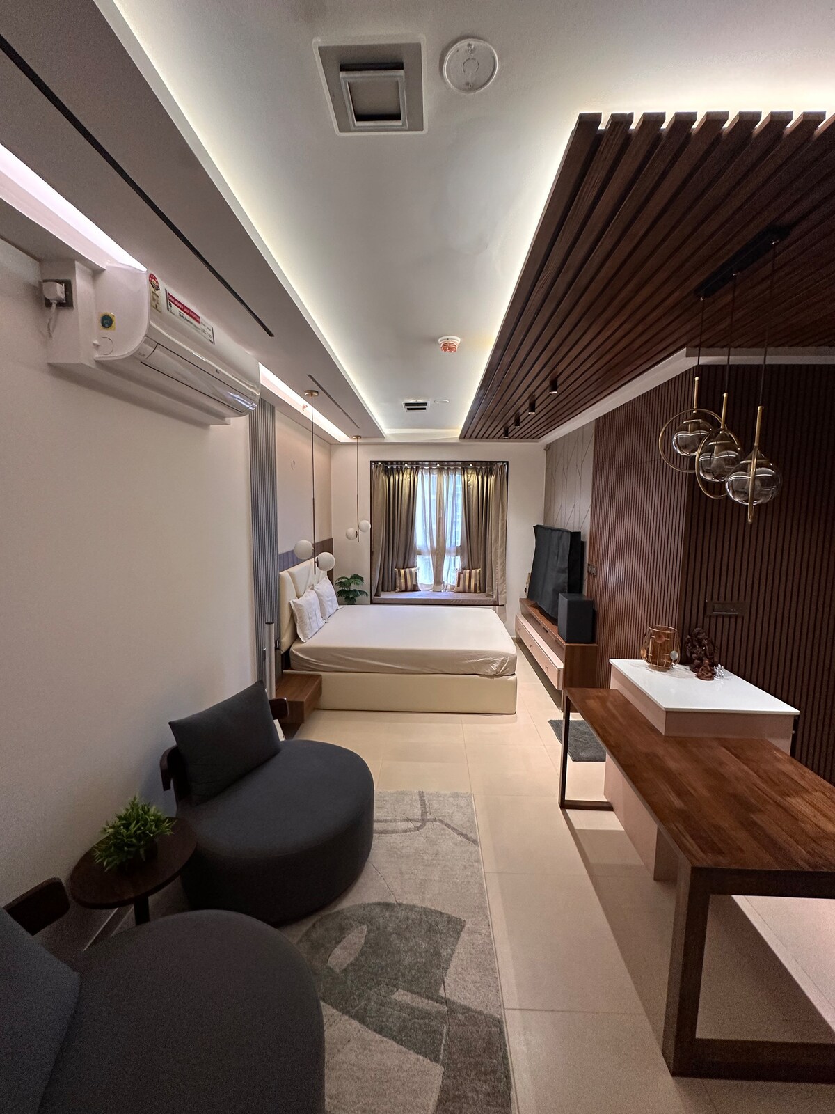 Nestled in the ❤️ of Bangalore, The Leela Residences is the perfect blend of luxury and comfort giving you the feeling of home with the amenities of a hotel. Staying here is that you enjoy hotel living while still experiencing a cozy, homely atmosphere. 24/7 security, access to a pool & gym, & rates at nearly 1/3the cost of a typical hotel, it’s an unbeatable choice. This fully furnished studio includes a washer, dryer, and dishwasher, a kitchen with utensils making it a home away from home