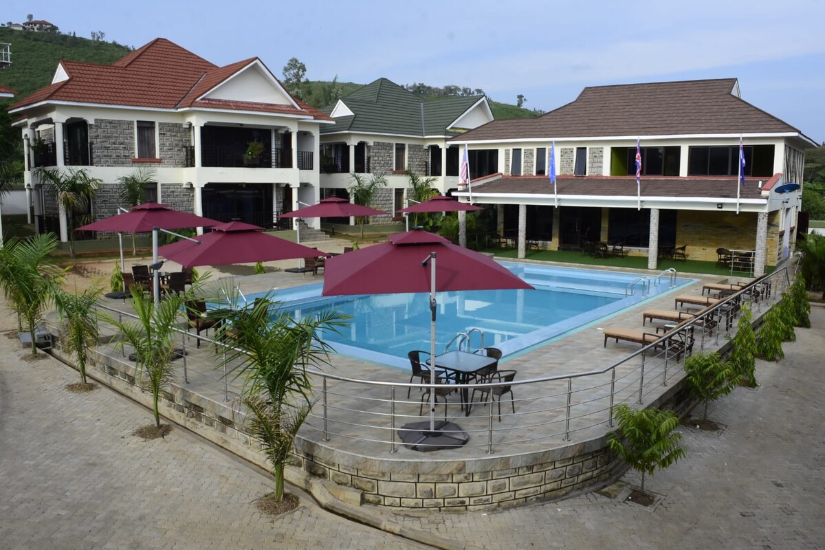 Địa điểm phong cách và độc đáo này tạo tiền đề cho một chuyến đi đáng nhớ. Nằm dưới chân đồi Riat Hills dọc theo Sân bay Kisumu - Đường Lake Basin Mall, đây là ngôi nhà yên tĩnh của bạn ở nơi xa. Với quyền sử dụng hạn chế, cơ sở này được thiết kế để giúp bạn, gia đình và bạn bè của bạn yên tâm trong thời gian lưu trú tại các căn hộ 2 phòng ngủ sang trọng. Nhà hàng Maya cung cấp cho bạn một dịch vụ khách sạn dự phòng đầy đủ hoàn chỉnh với hồ bơi nước nóng mở cửa đến 10 giờ tối và một cơ sở hội nghị.