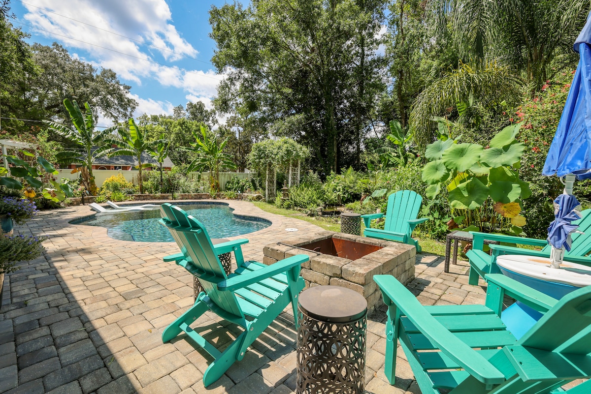 Beautiful pool home and private backyard oasis. This walkable neighborhood is quiet and popular with professionals and families. It's a short walk from many restaurants, bars, and entertainment. This home includes a heated* saltwater pool, pool table, huge covered lanai, fire pit, and campground-style grill. Enjoy this oasis, surrounded by tropical landscaping and pond. We are glad to offer a military/first responder discount of 10% per day up to $100 for your stay upon request w/ valid id.