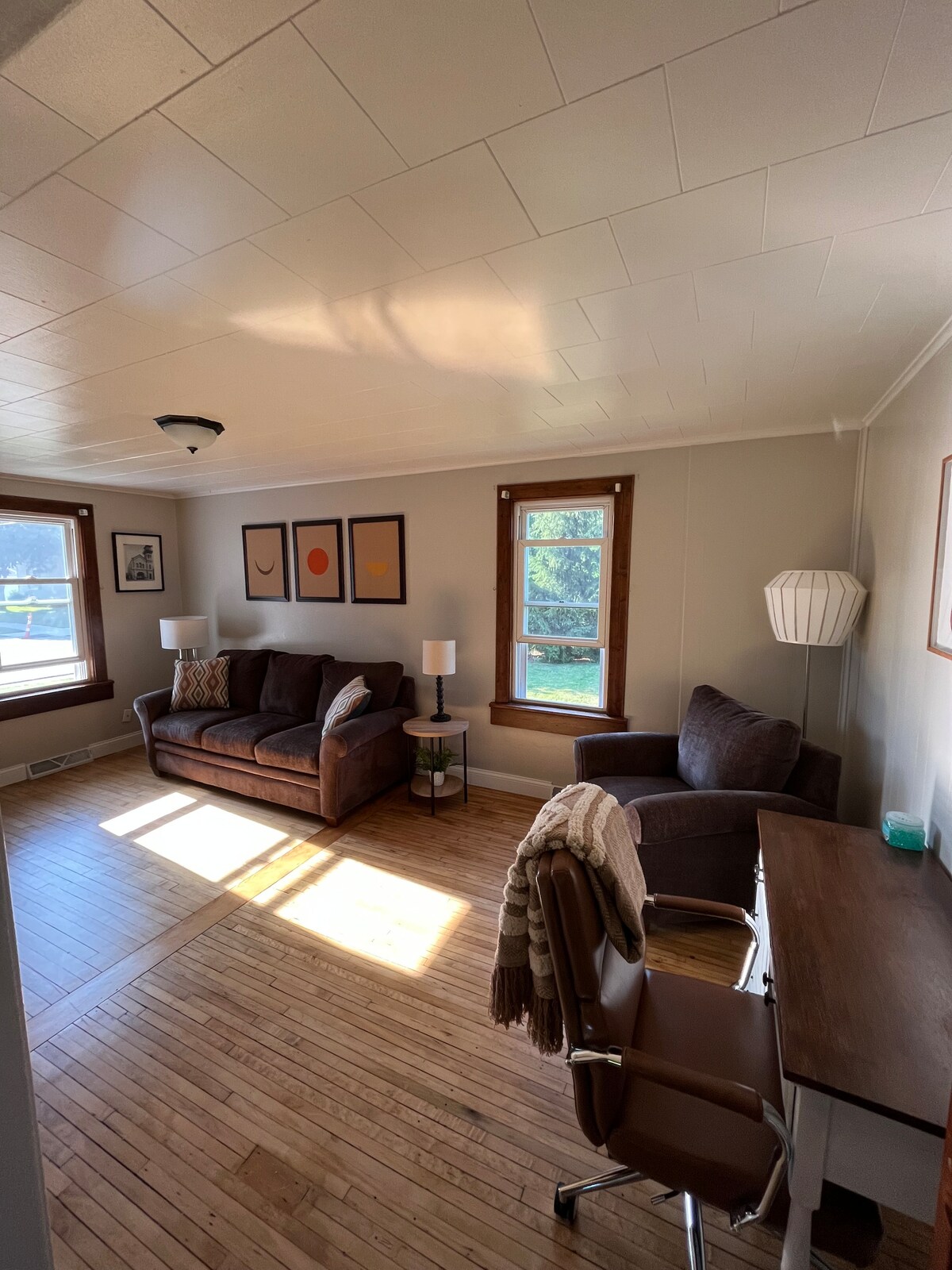 2 bedroom home with a living room and dining room, kitchen with appliances, laundry room and Big backyard. (Kid friendly) Grocery store, gas station, and restaurants are less than a mile away. (Within walking distance) Great, clean neighborhood. Only a mile from Menominee park, arena, and other destinations you may want to explore.