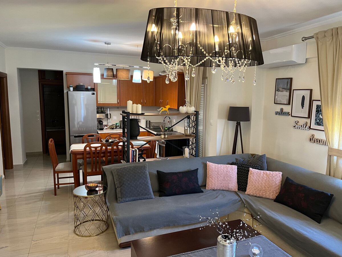 Căn hộ nằm ở tầng hai và tầng cao nhất của tòa nhà. Có hai phòng ngủ, một phòng phụ, một phòng khách lớn với bếp và một phòng tắm Có ba ban công. Ngay đối diện có một công viên nhỏ dành cho trẻ em. Siêu thị, lò nướng, hiệu thuốc, tất cả những thứ cần thiết đều cách đó 2 phút. Cách trung tâm Thessaloniki 15 phút đi xe ô tô. Xe buýt đô thị đi thẳng đến trung tâm, trạm dừng trước nhà. Nơi yên tĩnh và an toàn.