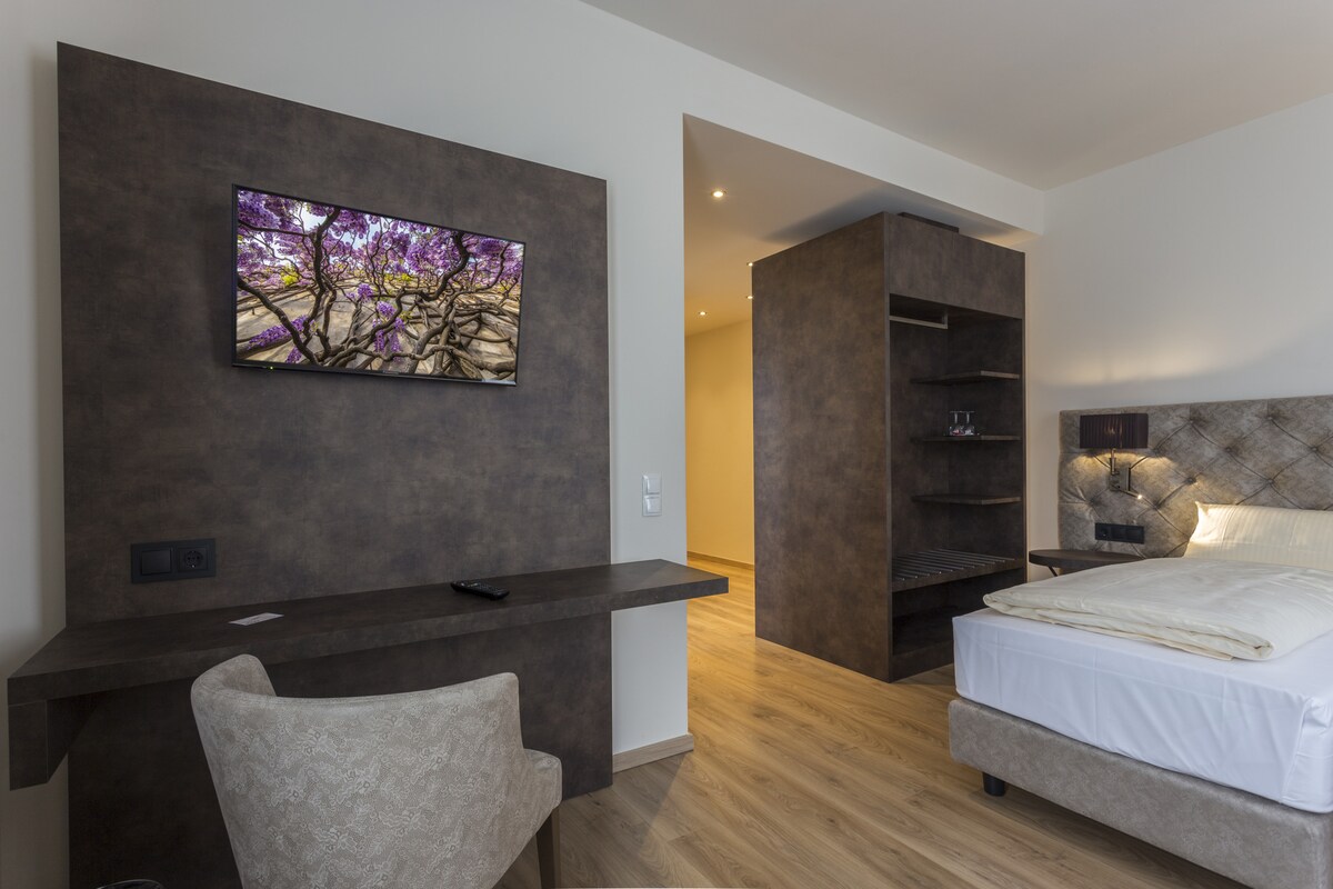 Hello, Welcome to the 3* Hotel Villa Bassermann! Our exclusive apartment awaits you for your short or long-term stay in Schwetzingen and offers you a great atmosphere and the best comfort: → 1 comfortable queen size bed 160x200 → 50 inch Smart TV & Sky access → Breakfast buffet for €17.90 per person/day → central location near Schwetzingen Castle
