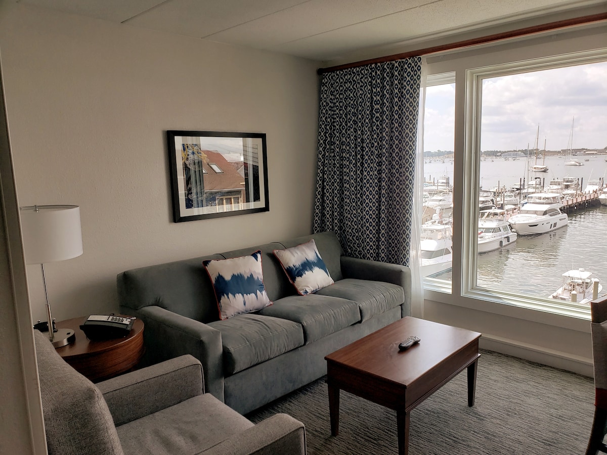 Our HARBOR SUITE: stay in Newport's most desirable hot spot! 🐶💕. Our recently renovated 1 bedroom 1 bath condo sits directly on Thames Street. The rental also comes with one off-street FREE parking space within 300 feet of our property. Our personal fav is the bright white seasonal sunroom with windows throughout attached to a walkout private deck with views of Newport Harbor. Don't worry about getting around, you're an easy walk to ALL. Beautifully decorated. AC in living room & bed room