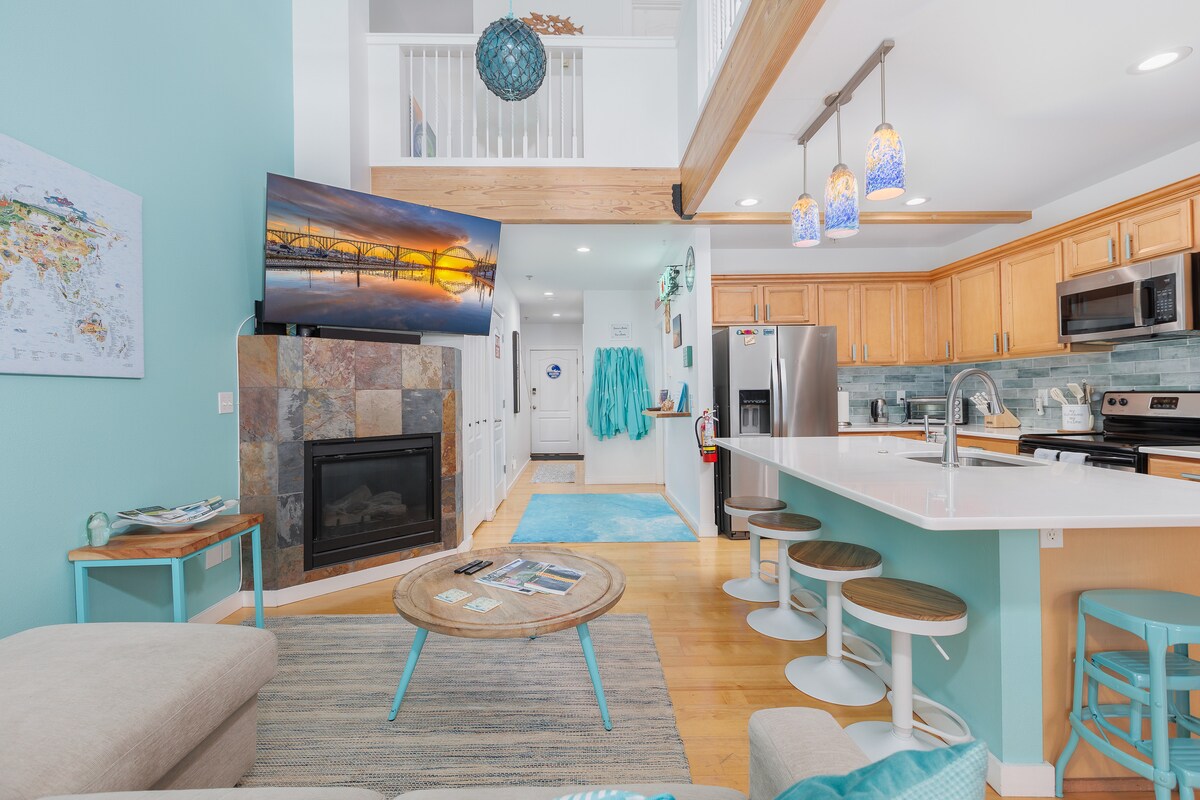 Perched on the top-floor corner, this oceanfront condo offers breathtaking panoramic views of Nye Beach, Yaquina Head Lighthouse, and the shimmering Pacific—an unforgettable setting for a romantic coastal retreat with stunning sunsets. • 2 King Bedrooms • Ocean-view jacuzzi tub – unwind in style • Fully equipped kitchen • Games & DVDs for cozy nights • Baby gear included • Roku TV + Wi-Fi • Floor-to-ceiling views • 2 bathrooms • Easy checkout