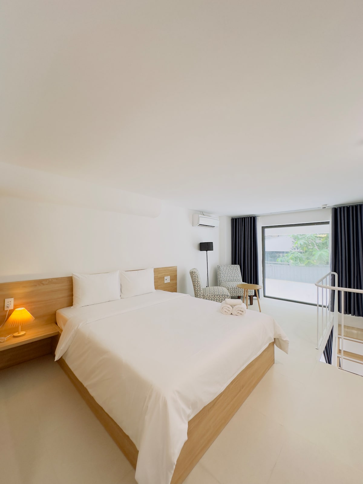 Bright and cozy loft apartment 501 at 38 Street 62, Thu Duc City. The room features a comfy mezzanine bed, private bathroom, kitchen, washing machine, and dining space filled with natural light. Perfect for couples or business travelers seeking peace and comfort near the Saigon River.