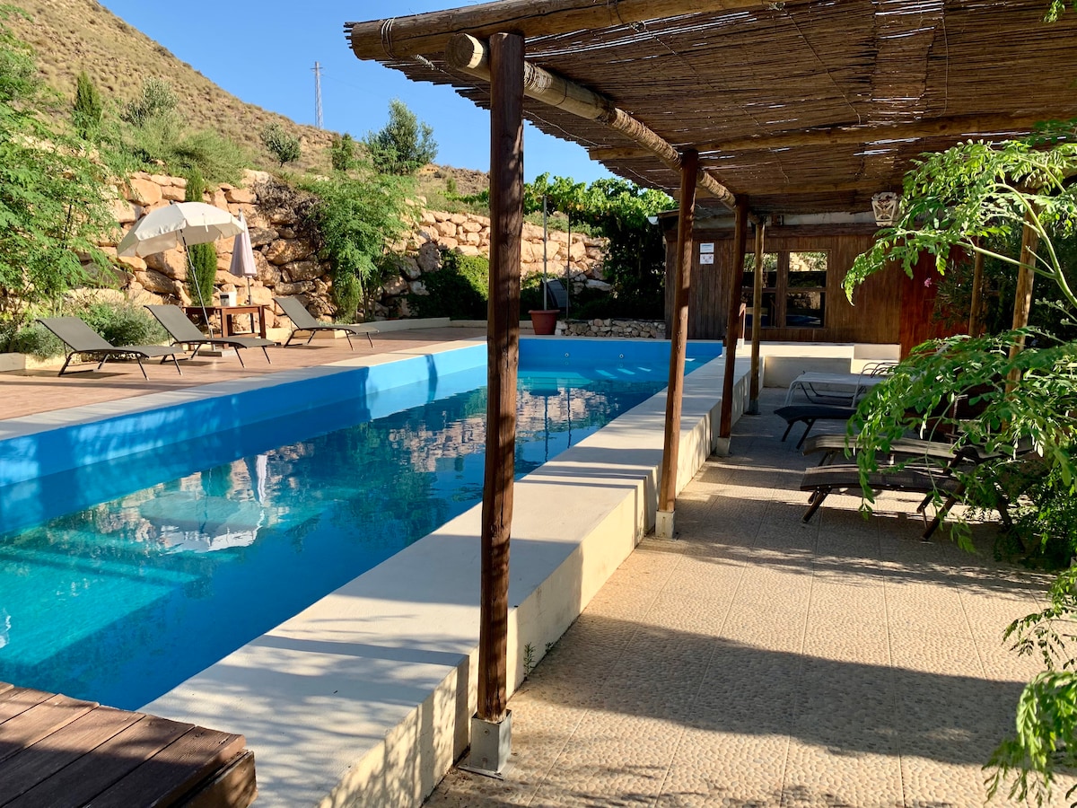 Kết nối lại với thiên nhiên với nơi nghỉ ngơi khó quên này trong một ngôi nhà nhỏ với lò sưởi được bao quanh bởi thiên nhiên và động vật, trong một trang trại nhỏ nơi bạn có thể thu thập trái cây và rau quả theo mùa, cũng như trứng gà và động vật nếu muốn, nó cũng có một hồ bơi nhỏ và khu vực nướng thịt nhìn ra Sierra Alhamilla và Cabo de Gata, cách trung tâm thị trấn 1 km và 25 phút bất kỳ bãi biển Cabo de Gata nào