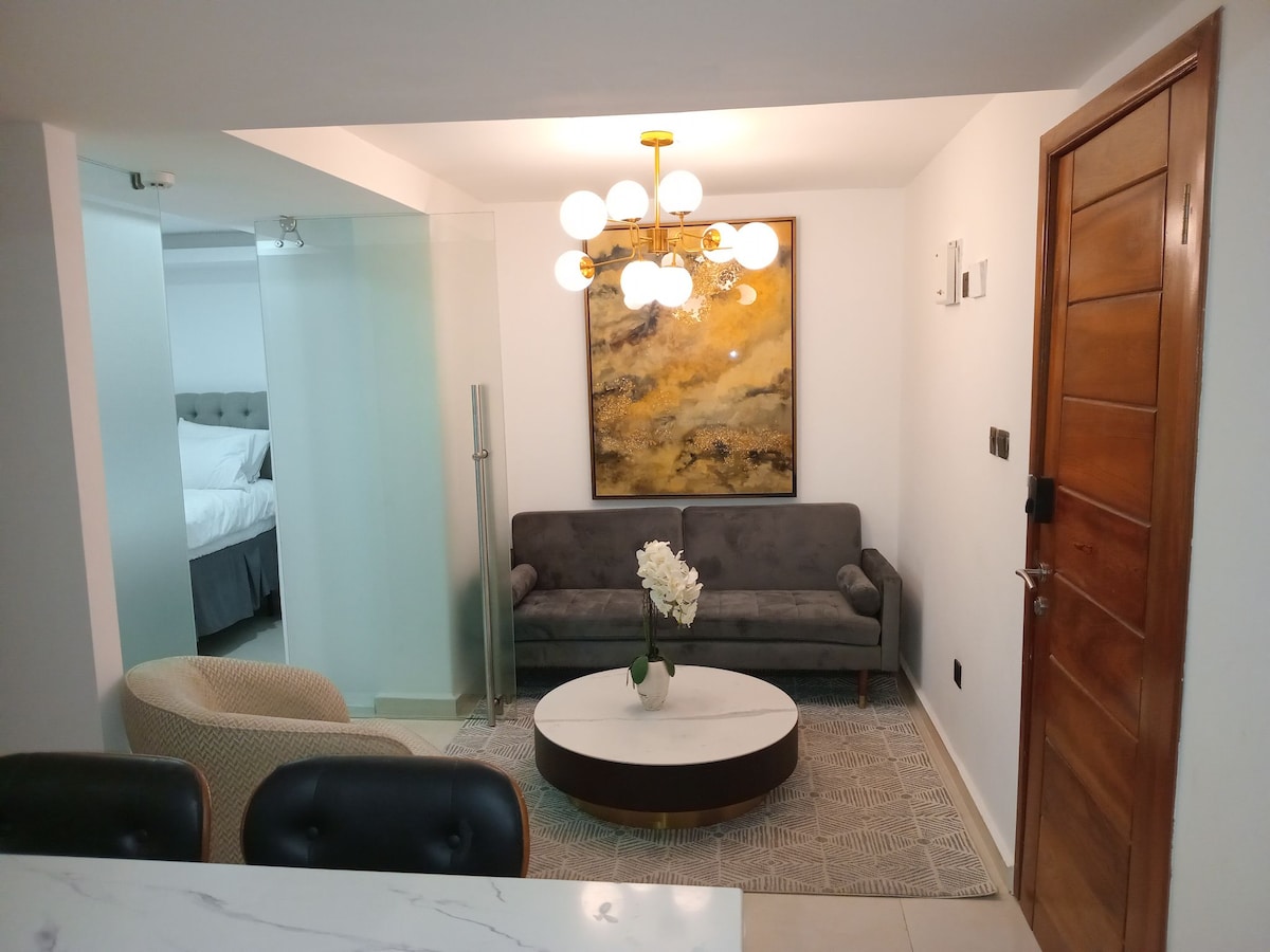 Căn hộ studio sang trọng với phòng tắm riêng, bếp nhỏ với không gian làm việc/khu vực ăn uống. Căn hộ nằm trong khu phố được tìm kiếm gần Đại sứ quán Hoa Kỳ tại Accra. Căn hộ có các tiện nghi hiện đại, phụ kiện cao cấp, trang trí hiện đại bao gồm một chiếc đèn chùm làm sáng căn hộ.