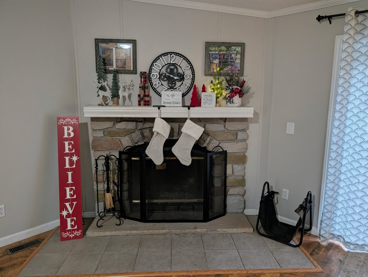 Đây là nhà của chúng tôi được bố trí như một ngôi nhà kiểu hai tầng. Nằm gần hồ Nolin, cách công viên hang động Mammoth chưa đầy 15 phút, cách tour tham quan hang động 25 đến 45 phút lái xe, 5 phút đến sân golf, 10 phút từ công viên du lịch xanh ngoài đường, 5 phút đến J đôi, có đường mòn xe đạp leo núi gần đó, chúng tôi có bãi đỗ xe kéo, 2 hố lửa, chúng tôi có thuyền kayak và xe đạp leo núi mà chúng tôi có thể thuê. Nơi nghỉ ngơi tuyệt vời để tận hưởng hoạt động ngoài trời theo nhiều cách, hoặc chỉ cần ở lại và chơi game trên bàn hoặc lựa chọn trong số hàng ngàn DVD.