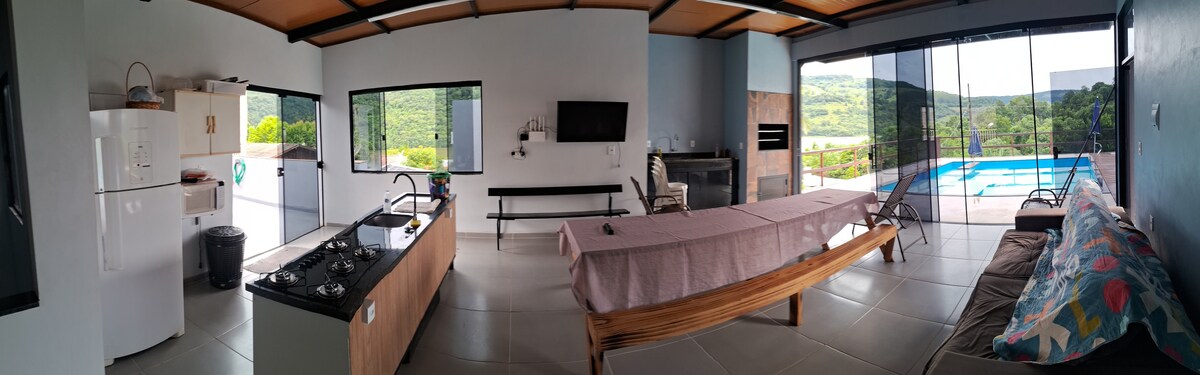 Chỗ ở thoải mái cho một gia đình 4 người. Hồ bơi nước nóng. Một bồn ngâm ở tầng trên. Thưởng thức trà, cà phê hoặc chimarrão nằm trên võng hoặc trên ghế đẩu của chỗ ở với tầm nhìn tuyệt vời. Cabin cách trung tâm Chapecó 23 km, với 22,6 km nhựa đường và 12,4 km từ cầu. * Chúng tôi không cung cấp bữa ăn. * Chúng tôi đề xuất các nhà hàng và cửa hàng tạp hóa gần lều. * Tiệc tùng hoặc sự kiện không được phép. * Cho phép cặp vợ chồng hoặc gia đình + thú cưng. Gặp gỡ và yêu nhau! 🥰