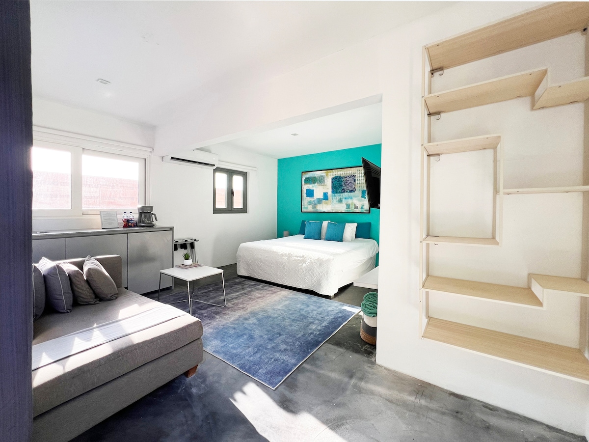 Studio xinh đẹp này phản ánh màu xanh của Aruba với thiết kế rất hiện đại và SẠCH SẼ, cung cấp giường cỡ KING rất thoải mái và gối cỡ King, nhà bếp đầy đủ chức năng, tủ quần áo đi bộ đẹp, phòng tắm hiện đại với spa như vòi sen mưa. Nằm ở tầng cao nhất của tòa nhà với tầm nhìn tuyệt đẹp ra trung tâm thành phố Aruba cũng như bến cảng! Tận hưởng hồ bơi vô cực và bồn tắm nước nóng trên tầng thượng với tầm nhìn 360 độ và phòng tập thể dục hiện đại nhìn ra mặt nước và tàu du lịch!