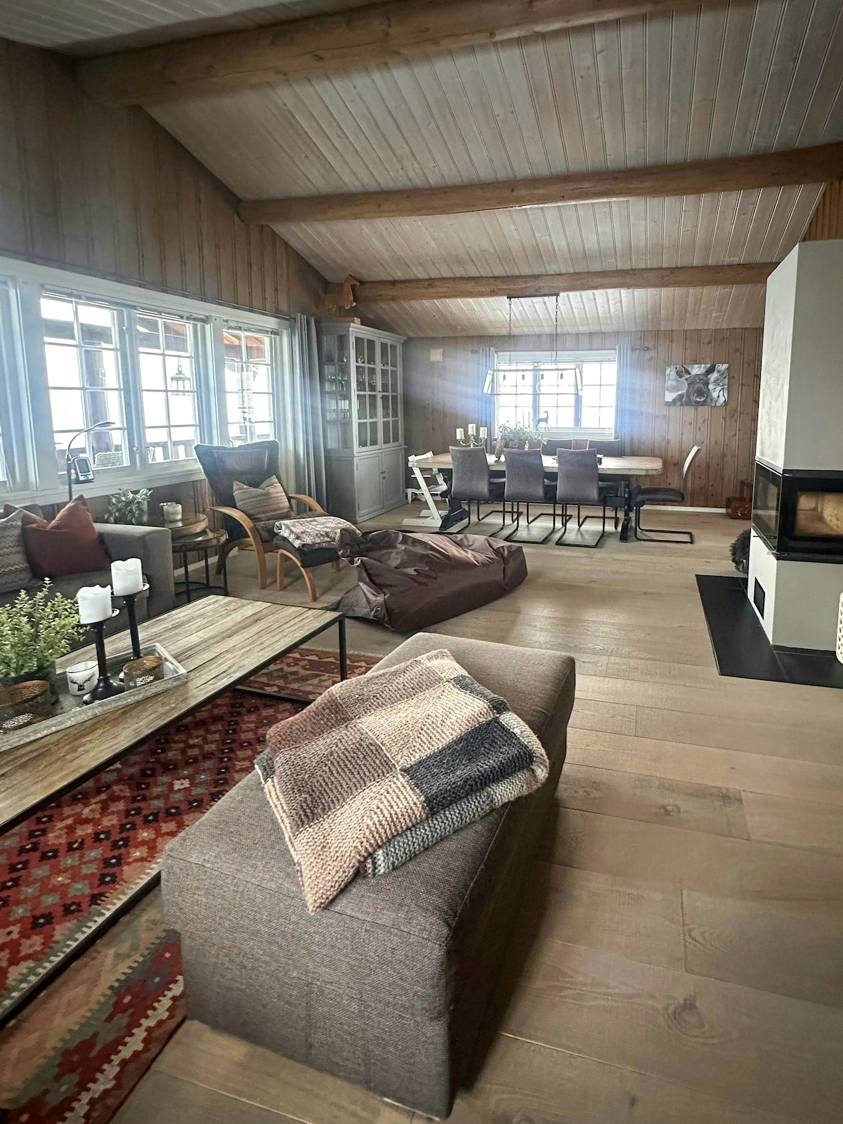 This is a modern, bright, and cozy cabin on one level, with 3 (4 bedrooms), 8 beds, and everything you need for a pleasant stay in the mountains. Two of the bedrooms have fold-down desks - perfect for workation. The modern fireplace will provide both comfort and warmth after a long day in the fresh mountain air. Electricity (ex. EV charging) included in the rent. The cabin is new, from 2022.