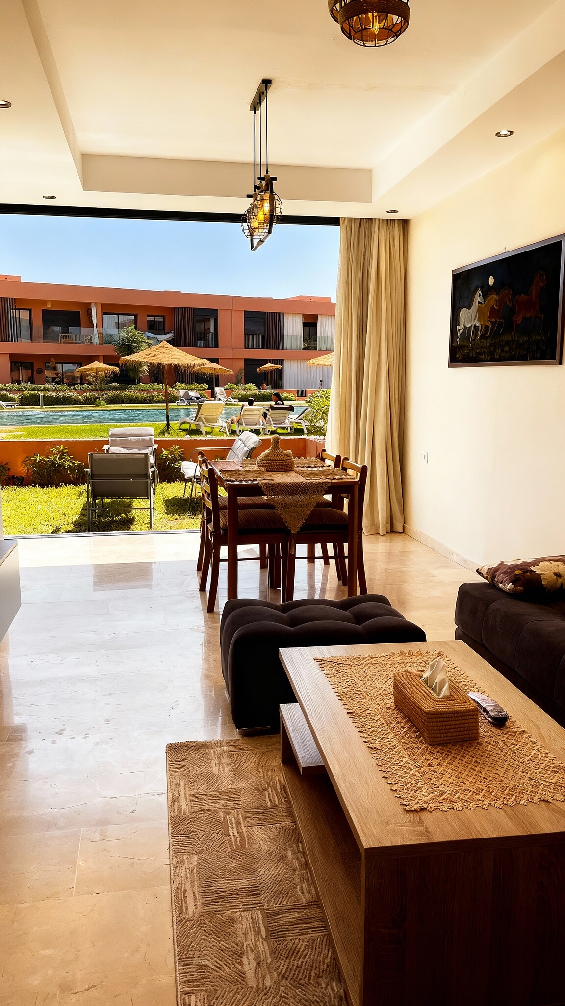 Cách sân bay 7 phút ✈️ & cách Jemaa el-Fna 10 phút 🌇 (nút giao thông đường Tahanaout và Amizmiz) ✅ 4 Hồ bơi🏊♂️, giường tắm nắng⛱️, vườn 🌳 ✅ 2 phòng ngủ (bao gồm một phòng ngủ chính cỡ king 👑) ✅ 2 phòng tắm🚿, khăn tắm, dầu gội đầu, sữa tắm ✅ Phòng khách có ban công, tầm nhìn ra Atlas 🏔️ ✅ Bãi đỗ xe an toàn 🚗 24/7 ✅ Wi-Fi 📶 (220 Mbps), 3 TV thông minh 📺 IPTV, điều hòa không khí❄️/hệ thống sưởi 🌡️. ✅ Nhà bếp được trang bị tiện nghi🍳, bát đĩa và gia vị Máy pha cà phê nguyên hạt Thích hợp cho gia đình và nhóm bạn bè