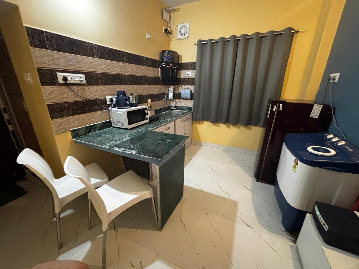 Chỗ nghỉ phục vụ bữa sáng !! Một tổ ấm xa nhà, cặp đôi thân thiện với sự yên bình và riêng tư. Cho dù bạn đang làm việc chính thức, chuyến đi gia đình hay cho bất kỳ chuyến thăm khẩn cấp nào đến Kolkata, bạn phải ghé thăm chỗ ở này. Một căn hộ ấm cúng với tất cả các tiện nghi (điều hòa, TV, Freeze, Wi-Fi miễn phí, bộ lọc nước RO, máy giặt, lò vi sóng, v.v.) để thư giãn hoặc làm việc và chỗ ở tuyệt vời cho thời gian lưu trú dài. Chỗ ở rất an toàn với thiết bị nấu ăn của riêng bạn. Trong vòng 15 phút từ Sân bay và 5 phút từ ga tàu điện ngầm sân bay.