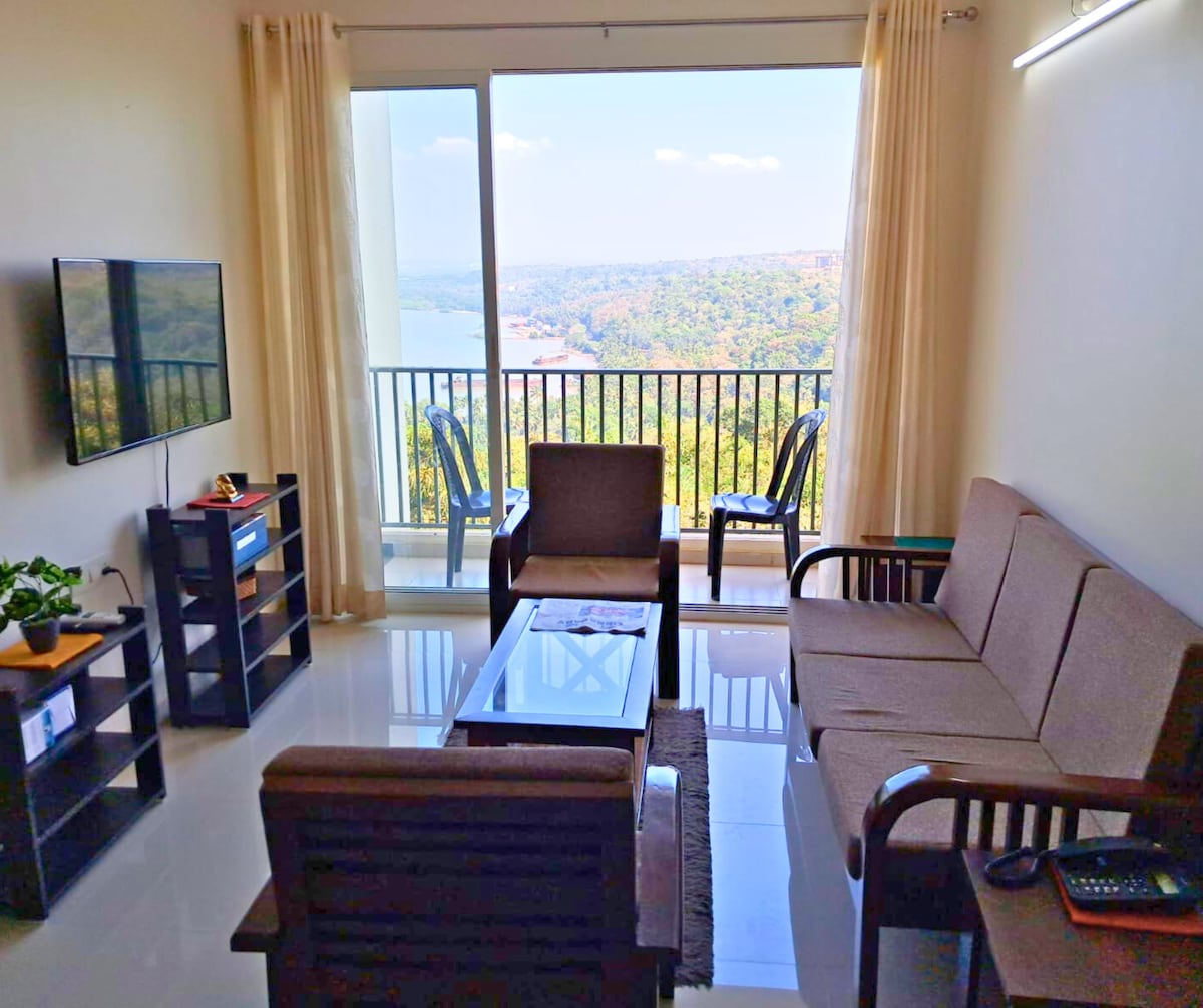 Nhà nghỉ dưỡng hai phòng ngủ AC nằm trên vách đá Dabolim, cho tầm nhìn tuyệt vời ra cửa sông từ tất cả các phòng. Viên ngọc ẩn này tự hào có ban công rộng rãi để tận hưởng bình minh - hoặc hoàng hôn :) Cách sân bay 5 phút! Panjim hoặc South goa cách 30 phút bằng ô tô. Được trang bị đầy đủ tiện nghi và có nhà bếp đầy đủ chức năng, RO, lò vi sóng, v.v. Phòng khách điều hòa không khí với TV thông minh. Sử dụng hồ bơi chính có chiều dài đầy đủ, phòng tắm hơi, phòng tập thể dục, bóng quần, bàn bi-a, v.v. Hồ bơi vô cực bị hạn chế.