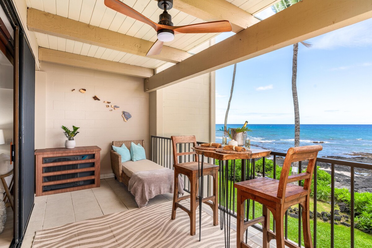 Serenity in Kona- with epic ocean views! Wake up with the ocean waves crashing below. Hang out on the lanai with some Kona coffee from the Green Flash cafe next door. You have a front row seat for whale watching during whale season. Or, hang out and enjoy the sunsets- at times with our local manta ray! We have a queen sofa bed, and AC. Close to town- an 18 minute walk. Quiet, very little road noise here. You can rent bikes too across the street.