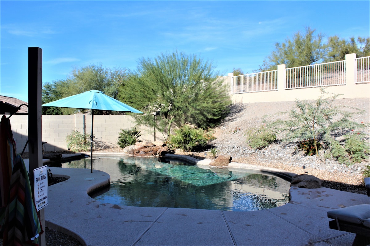 Thư giãn theo phong cách tại khu nghỉ dưỡng Estrella Mountain 3 phòng ngủ của chúng tôi với hồ bơi nước nóng, vỉ nướng sân sau riêng và Wi-Fi nhanh. Giấc ngủ: 1 giường cỡ king và 2 giường cỡ queen với khăn trải giường chất lượng khách sạn Vui chơi: Đồ chơi hồ bơi, trò chơi trên bàn và đường mòn gần đó Làm việc: Bàn làm việc riêng và internet 500 Mbps Cách Estrella Lakes, sân golf và nhà hàng vài phút. Đặt chuyến đi của bạn ngay hôm nay! Có sẵn dịch vụ cho thuê xe! Vui lòng hỏi xem bạn có muốn định giá và các tùy chọn không. Chúng tôi có thể rời sân bay hoặc sẵn sàng và chờ bạn tại nhà khi bạn đến nơi. Chúng tôi sẽ