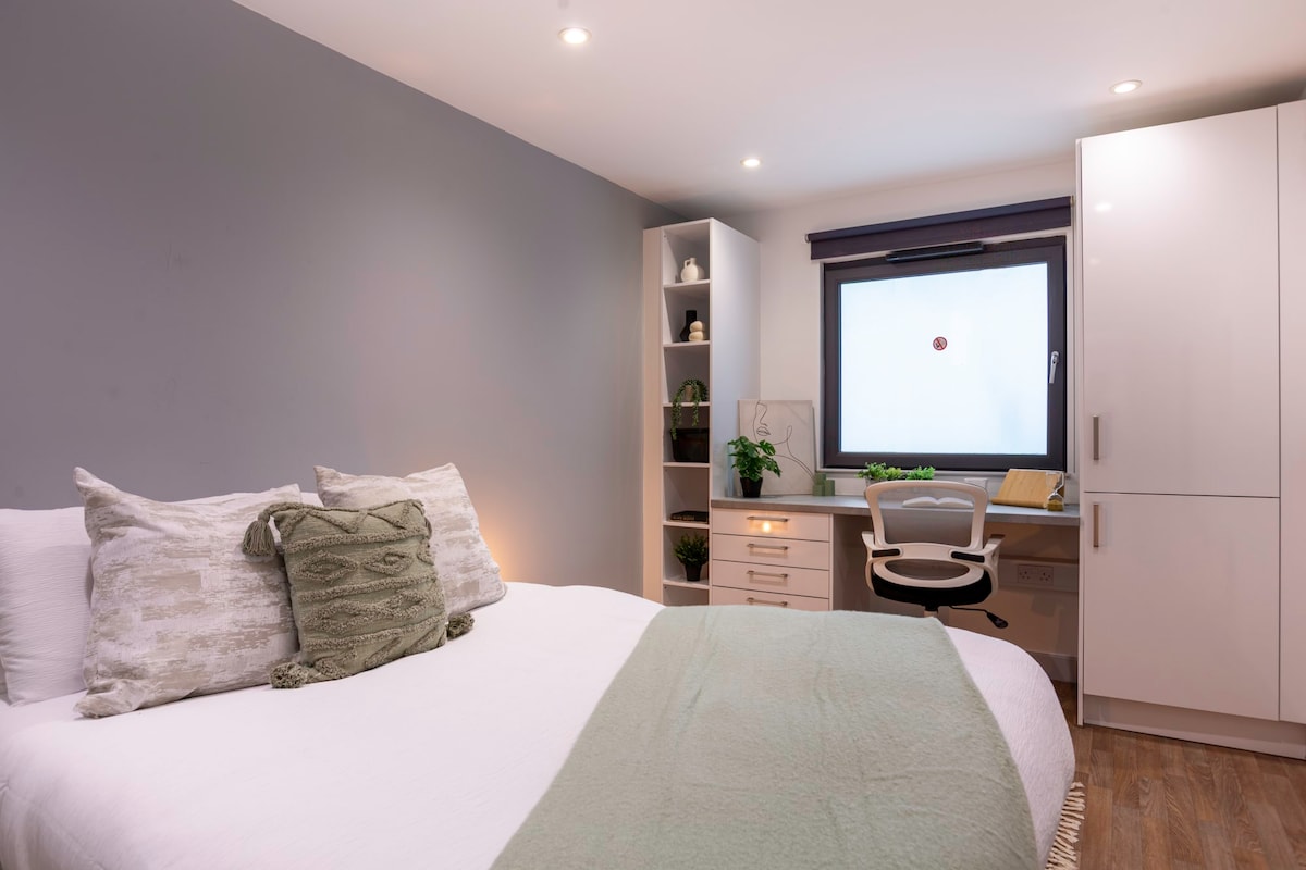 This student-only studio offers a comfortable bed, a private en-suite bathroom with a shower, and a dedicated study desk and chair. The studio also includes a private kitchenette equipped with essential appliances such as a hob, microwave, and fridge. High-speed WiFi is included with no data limits, providing a convenient and independent space for studying and relaxing.