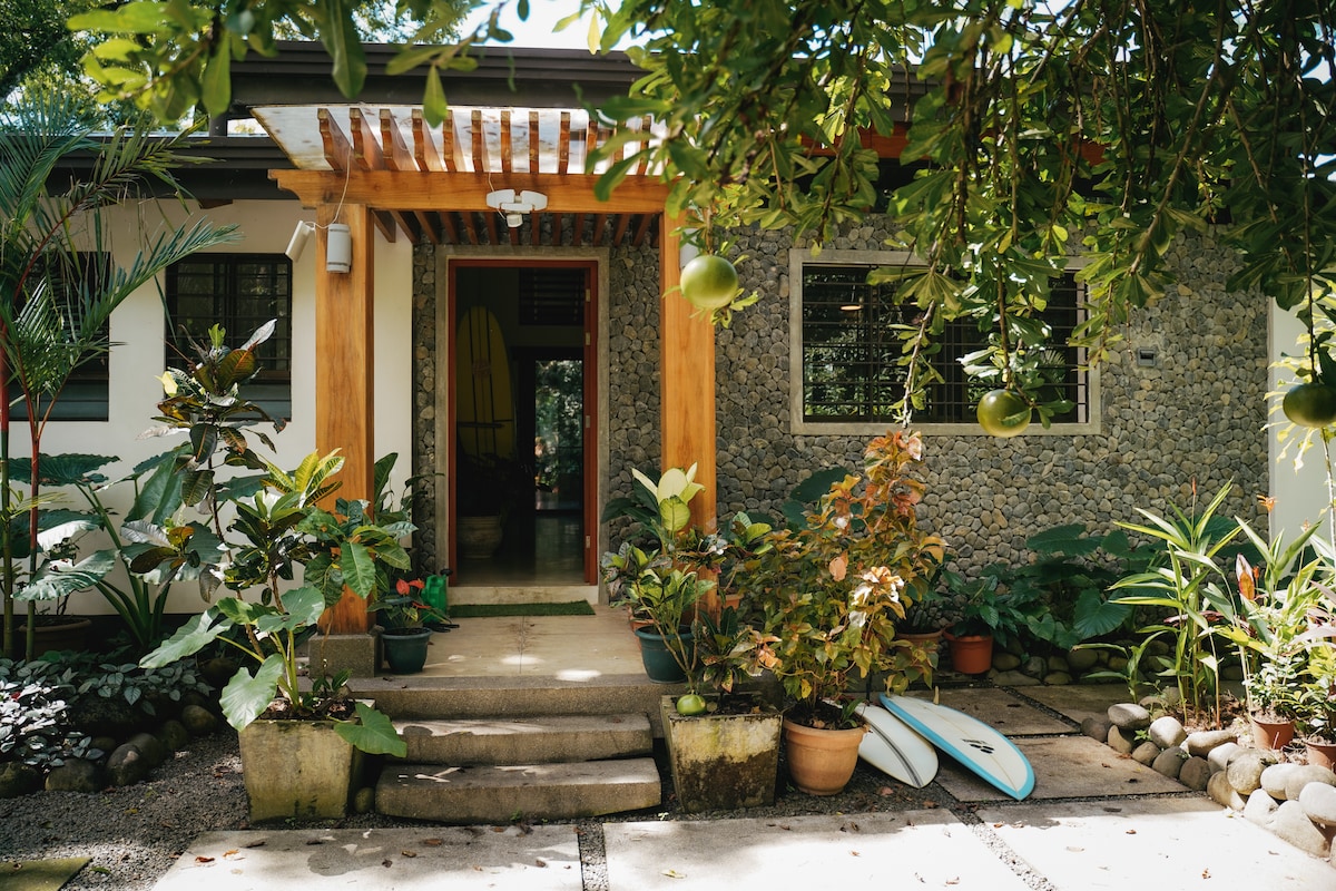 Chia sẻ sân đầy cây với khỉ, chim và kỳ nhông, ngôi nhà gỗ tếch nhẹ, thoáng mát này chỉ cách bãi biển 50 mét, gần trung tâm Sámara. Khung cảnh thiên nhiên tuyệt vời và âm thanh đại dương. Ngôi nhà thoáng mát này có nhà bếp không gian mở - phòng khách với nhiều chi tiết nghệ thuật, nguyên bản trong rừng tái chế địa phương; sân thượng, ăn uống ngoài trời, võng và vườn. Bạn có thể đi bộ bất cứ nơi nào trong vài phút và đi chân trần ra bãi biển! LƯU Ý: Chúng tôi KHÔNG có điều hòa nhiệt độ và một số cửa sổ có MÀN HÌNH (không có kính) để có thêm luồng không khí!