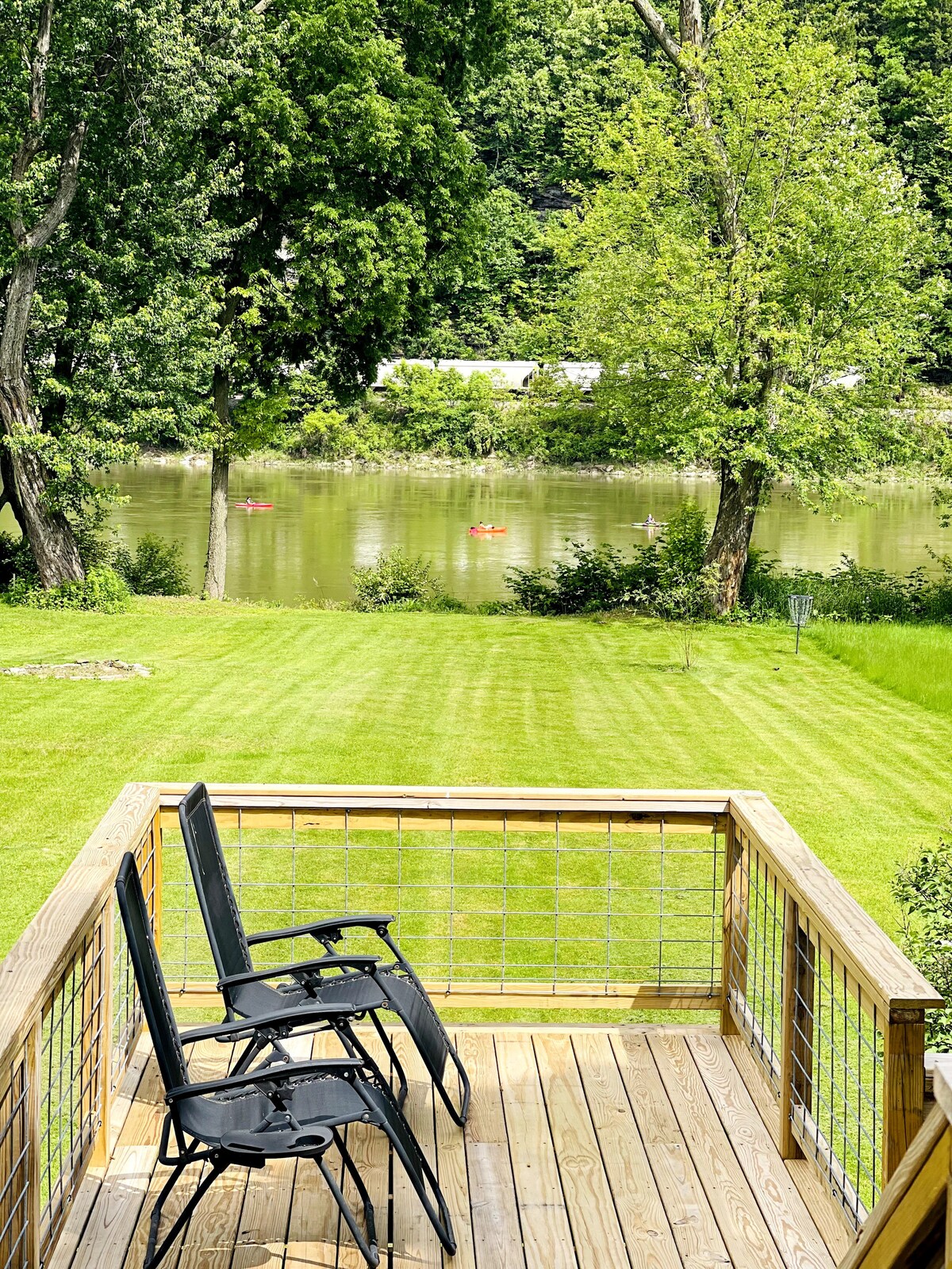 Căn hộ hoàn toàn riêng tư với bồn tắm riêng và không gian ăn uống / văn phòng trong cabin gỗ ven hồ. Lối vào riêng, có khóa của bạn cách bờ sông vài bước chân, hãy thoải mái chèo trong một trong những chiếc thuyền kayak, thuyền hoặc xuồng của chúng tôi... hoặc nếu tâm trạng khiến bạn bất ngờ, hãy đốt lửa trại. Chỗ ở này là một ốc đảo ẩn - dễ dàng tiếp cận Rickbegin Glen, Knoebels Grove, Art of Floating (bể cá), Sân golf % {line Hills, Old Tioga Farm (nhà hàng ăn uống ngon), leo núi đá và sông Susquehanna.