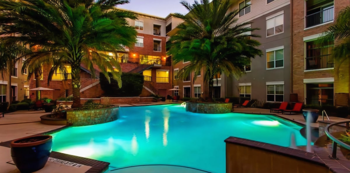 Trải nghiệm Houston trong một căn hộ hiện đại rộng rãi với những rung cảm và tiện nghi tuyệt vời. Đơn vị: Wi-Fi nhanh như→ chớp → Giường King thoải mái Không gian làm việc→ chuyên dụng + Màn hình Tivi thông minh phòng khách→ 55" Tivi thông minh phòng ngủ→ 50 inch Bếp → đầy đủ tiện nghi Bãi đỗ xe→ riêng của máy→ giặt và máy sấy (Tự chịu rủi ro khi đỗ xe) Tiện nghi: → Tầm nhìn và phòng chờ → Hồ bơi + Spa Phòng tập thể dục→ đầy đủ kích thước Lý tưởng cho khách đến thăm Trung tâm y tế Texas, thực tập sinh/công nhân chăm sóc sức khỏe, y tá du lịch và khách đi công tác.