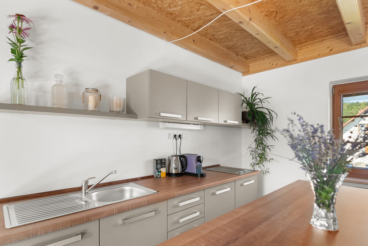 The comfortable apartment is a part of a stylish rural building from 1844. The interior is light thanks to a large panoramic window with a unique mountain view. The inside atmosphere can be made special by the Hi-Fi sound system. There is a possibility to make fire in a stove. A beautiful garden with a little stream, fireplace, sitting area with a children's sandbox is attached. Parking is safe and comfortable straight by the apartment entrance.