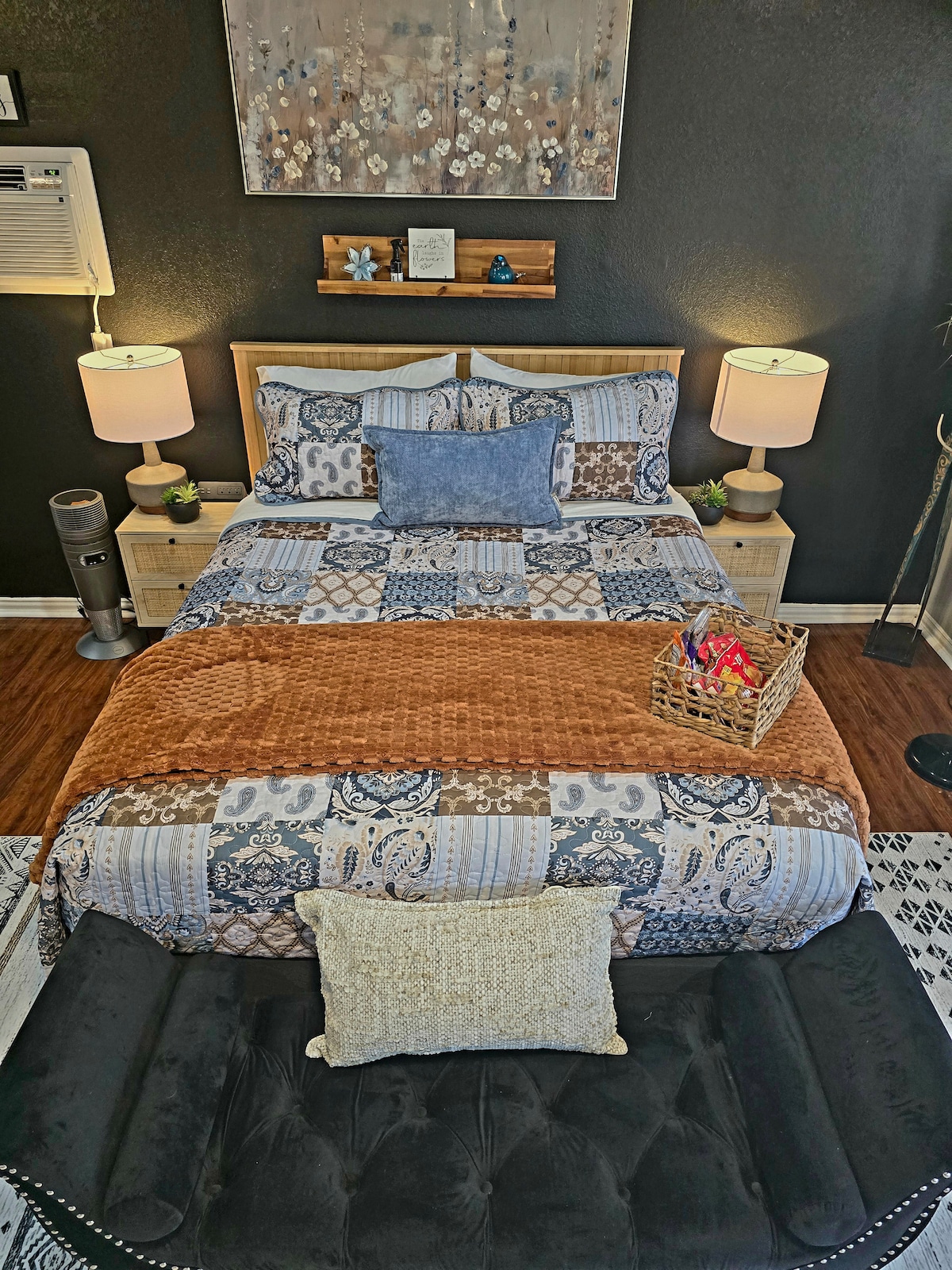 This cozy MICRO COTTAGE (850sq feet) is small in size but big on charm! Inside, you’ll find Victorian-inspired touches, a comfy sofa-futon, three snug sleeping areas, and a micro-kitchen ideal for light meals. Outside, enjoy string-lit patio seating and an 8-ft stock tank pool—perfect for cooling off in the summer time. Whether you’re looking for a restful weekend, a romantic escape, or a unique tiny-home experience, this micro-cottage offers comfort and character in a one-of-a-kind setting.