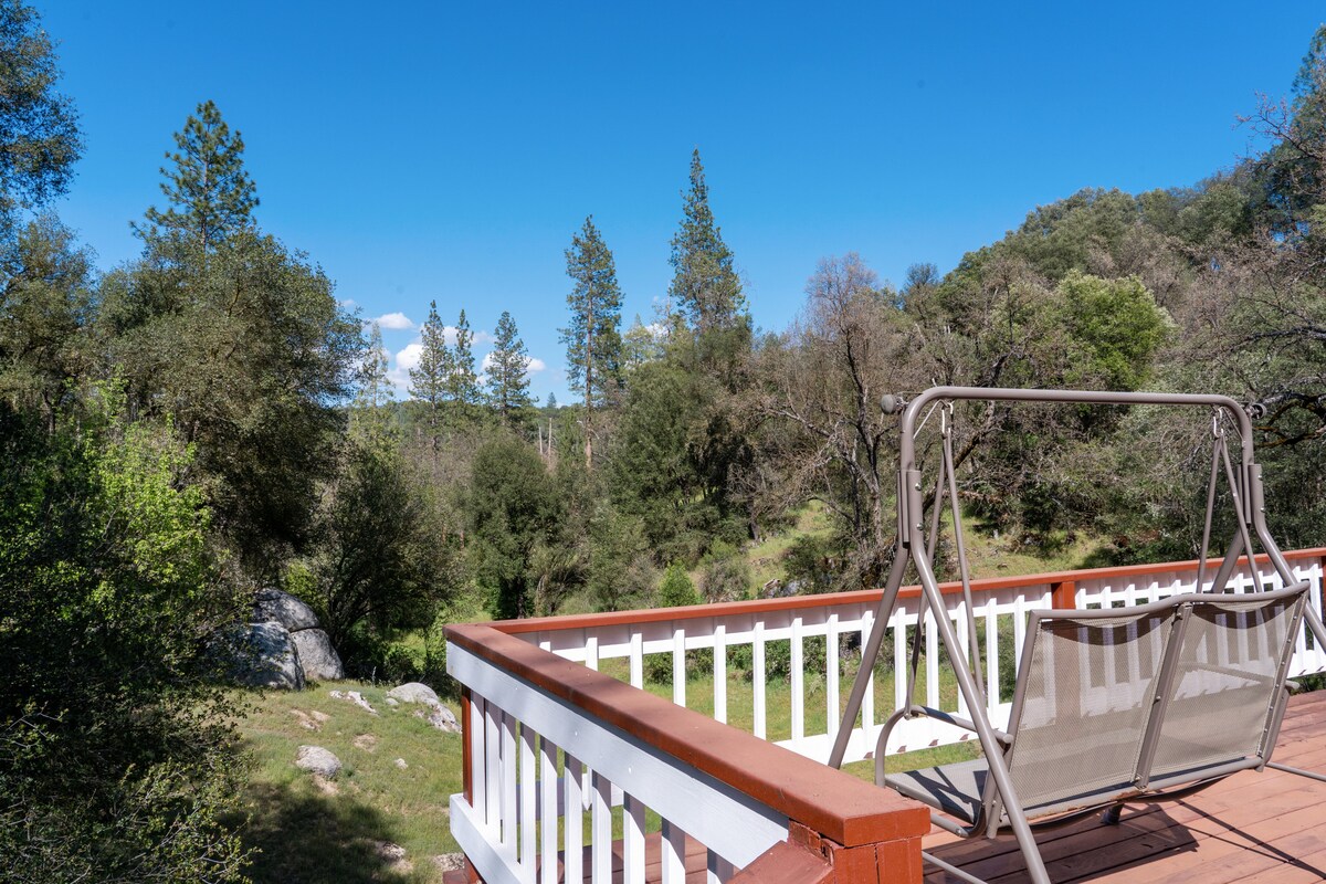 ✨ Chào mừng bạn đến với kỳ nghỉ trên núi ✨ 🏔️Tận hưởng toàn bộ diện tích đất riêng rộng hơn 1 mẫu Anh trong ngôi nhà 3 phòng ngủ/5 giường/2 phòng tắm được trang bị đầy đủ tiện nghi, thân thiện với gia đình này - hoàn chỉnh với hố lửa ngoài trời, máy karaoke, bồn tắm nước nóng, phòng trò chơi, bộ đồ chơi, bộ sạc EV, thân thiện với vật nuôi với sân có hàng rào đầy đủ. 🏔️Nằm cách Hồ Bass 10 dặm và cách lối vào Cổng Nam Yosemite 20 dặm. Cửa hàng tạp hóa, nhà hàng, cửa hàng mua sắm, quán cà phê và bất kỳ thứ gì khác mà bạn có thể cần lái xe 5 dặm.