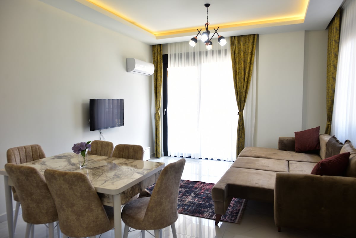Căn hộ 1 +1 hướng biển đáng yêu. Lexus Residence (70m2) Với Nội thất mới, lối ra bãi biển và tầm nhìn ra biển. Tất cả các hoạt động đầy đủ theo mùa với ban công lớn để thưởng thức cà phê buổi sáng và bữa ăn của bạn Tự nhận phòng bằng chìa khóa thông minh Cách Trung tâm 7 km và cách Sân bay Gazipasa 35 km. Tùy thuộc vào mùa Hồ bơi lớn trong nhà và ngoài trời, Phòng tập thể dục, Cầu trượt nước, Sân tennis, Phòng trò chơi, Rạp chiếu phim, Phòng chơi trẻ em. Phòng tiệc, khu vực BBQ và an ninh 7/24 (Bát và Phòng xông hơi Thổ Nhĩ Kỳ mở cửa vào cuối tuần)