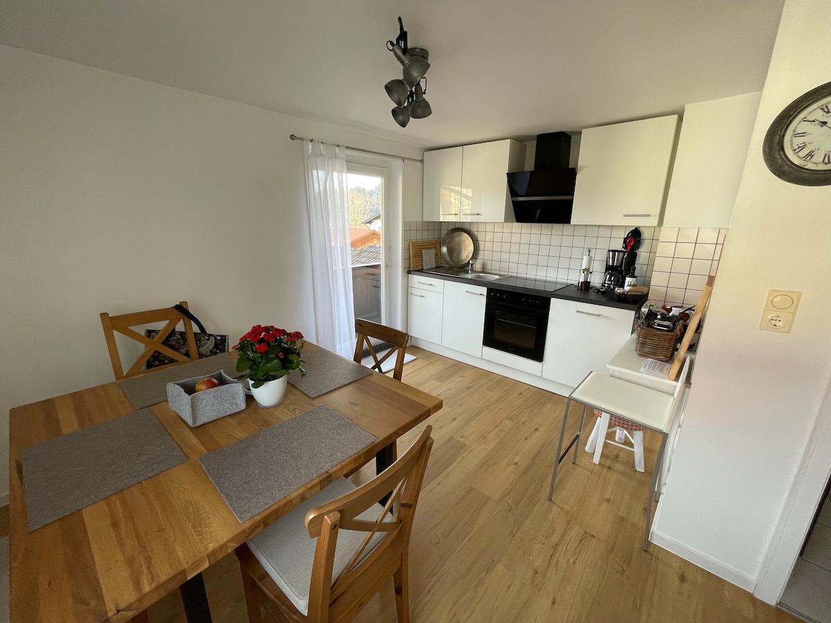 Đã lên lịch một lúc ở Allgäu? Với căn hộ ấm cúng của chúng tôi, bạn có thể. Căn hộ rộng 50m2 nằm ở tầng một của ngôi nhà cũ của chúng tôi (cửa hàng thịt cũ từ năm 1894, mà chúng tôi đã mua vào năm 2019 và cải tạo thành từng mảnh), có một phòng ngủ với giường đôi, cũng như phòng khách với giường sofa thoải mái. Bếp đầy đủ tiện nghi, cũng như phòng tắm với bồn tắm/nhà vệ sinh, cũng như sân thượng. Chúng tôi cách nhà ga 3 phút, nhưng không có tiếng ồn tàu hỏa đáng lo ngại, lý tưởng có thể đến bằng phương tiện giao thông công cộng.