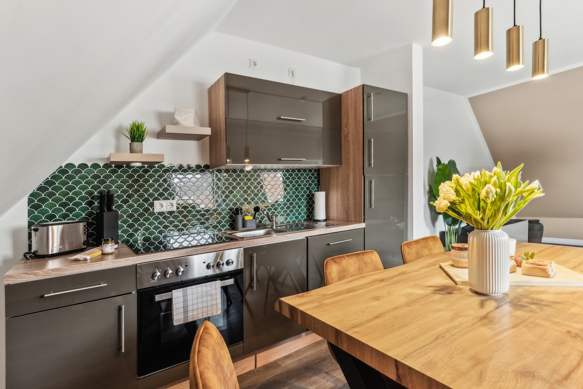 Căn hộ tầng hầm mới được xây dựng gần ga tàu và lâu đài. Một nhà bếp đầy đủ tiện nghi với bếp, tủ lạnh, máy rửa chén, máy pha cà phê và máy nướng bánh mì cung cấp cho bạn tất cả sự tự do bạn cần cho các buổi tối ẩm thực trong khu vực ăn uống hoặc trên sân thượng lớn với bếp nướng gas. Giường sofa mới được trang bị nệm đầy đủ. SmartTV với Prime, Disney, rtl+ và Alexa đi kèm với sự thư giãn. Trong phòng tắm có vòi sen, bồn tiểu và máy sấy quần áo.