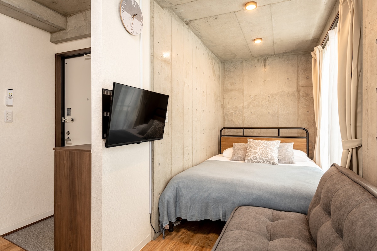 Located near Akihabara and Okachimachi with easy access to several train lines, this cozy wood-themed studio offers a calm and modern stay. The 25㎡ room includes a queen bed, desk, 55-inch TV, and printer. The kitchen has a gas stove, microwave, toaster, BALMUDA kettle, rice cooker, and cookware. A shower room, separate toilet, washing machine, and amenities are provided. Soft lighting and natural wood create a relaxing space ideal for both business and leisure.