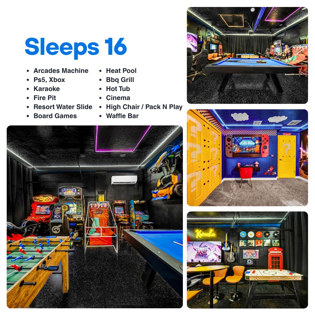 Professionally designed for an unforgettably FUN and HASSLE-FREE vacation! ☆ DK GAME ROOM with ARCADE ☆ OUTDOOR smart Projector ☆ RESORT CLUBHOUSE ☆ LAKE VIEW ☆ Private heated POOL and SPA ☆ Ultra comfortable beds. Sleeps up to 20 guests ☆ CUSTOM Little Mermaid room with slide ☆ EPIC Star Wars themed bedroom with slide ☆ Smart TVs in every bedroom ☆ Luxury linens ☆ Fully stocked COFFEE BAR ☆ Fully stocked kitchen with cookware, dinnerware with extras ☆ Popcorn bar 20 Mins to Disney World