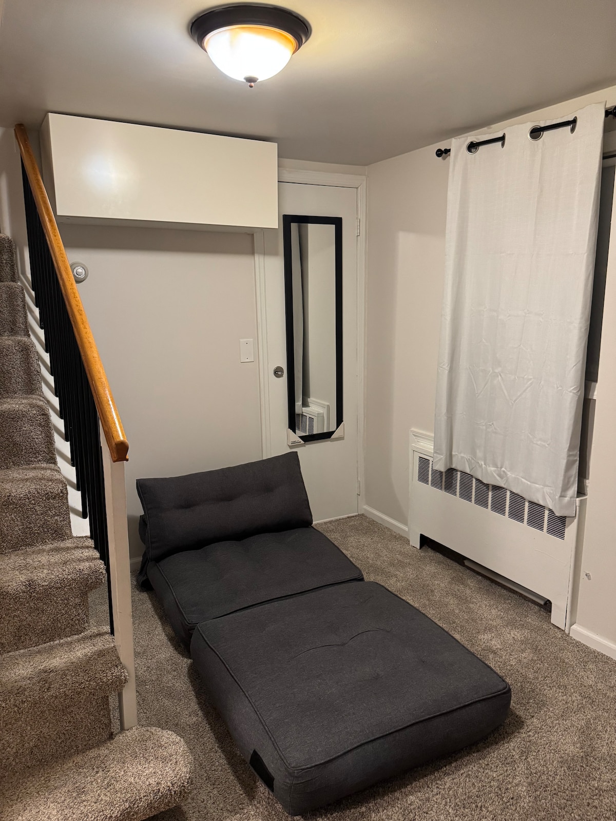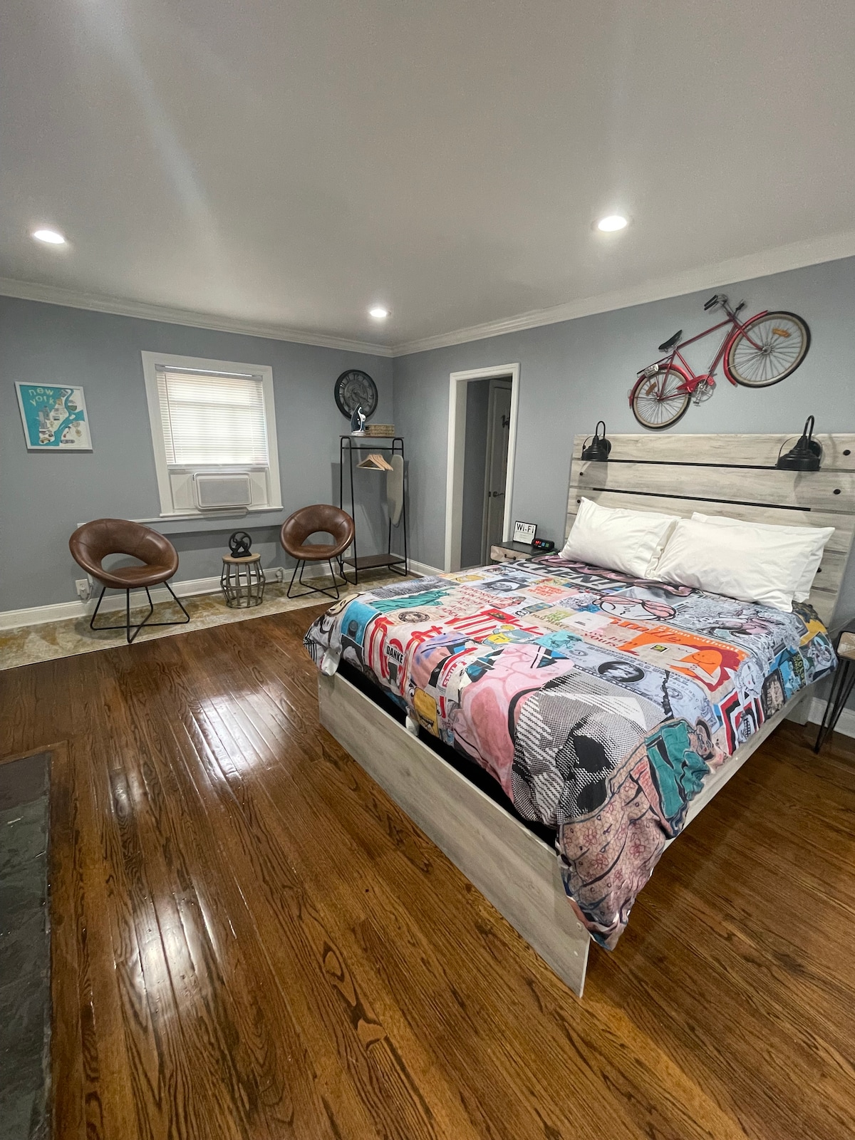 Phòng riêng mới được cải tạo nằm ở tầng hầm với lối vào và phòng tắm riêng. Giường cỡ King có thể chứa 2 người. Thiết bị chiếu sáng thông minh và ghế sofa điện để thêm thoải mái. Khu vực giải khát nhẹ với lò vi sóng, tủ lạnh, máy nướng bánh mì mini, ấm đun nước điện và Keurig. Gần bệnh viện Northwell và 20 phút đi bộ đến ga tàu LIRR. 10 phút lái xe đến tất cả các siêu thị, cửa hàng, thư viện và Stepping Stone Park. Chủ nhà rất dị ứng với mèo và chó. Không cho phép mang theo thú cưng!