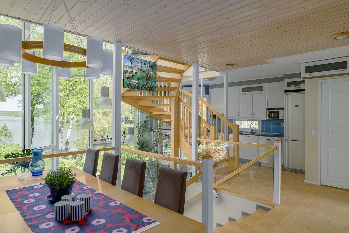 Khung cảnh tuyệt đẹp của công viên quốc gia mở ra mọi hướng từ cửa sổ của ngôi nhà. Những con đường mòn ngoài trời bắt đầu ngay từ cửa trước! Thư giãn trong hơi nước nhẹ nhàng của phòng xông hơi truyền thống của Phần Lan và ngâm mình trong bồn tắm nước nóng dưới bầu trời đầy sao (nước sạch mới cho mọi khách - cũng vào mùa đông). Trẻ em sẽ được tận hưởng sân rộng với nhà vui chơi, bạt nhún lò xo, xích đu và đồ chơi trong sân. Biệt thự nằm cách Sân bay Helsinki 39 km và cách trung tâm Helsinki 36 km.