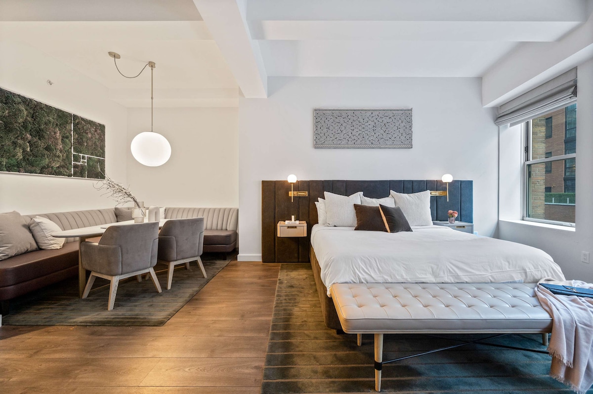 Mint House 70 Pine by Kasa blends style and function in Manhattan’s Financial District. Choose from hotel rooms and suites with kitchenettes or full kitchens, with access to amenities including the fitness center and meeting spaces, and on-site Michelin-starred dining at Crown Shy and SAGA. Our tech-enabled rooms and suites offer self check-in at 4pm. We provide 24/7 on-site Front Desk services, including guest support by text.