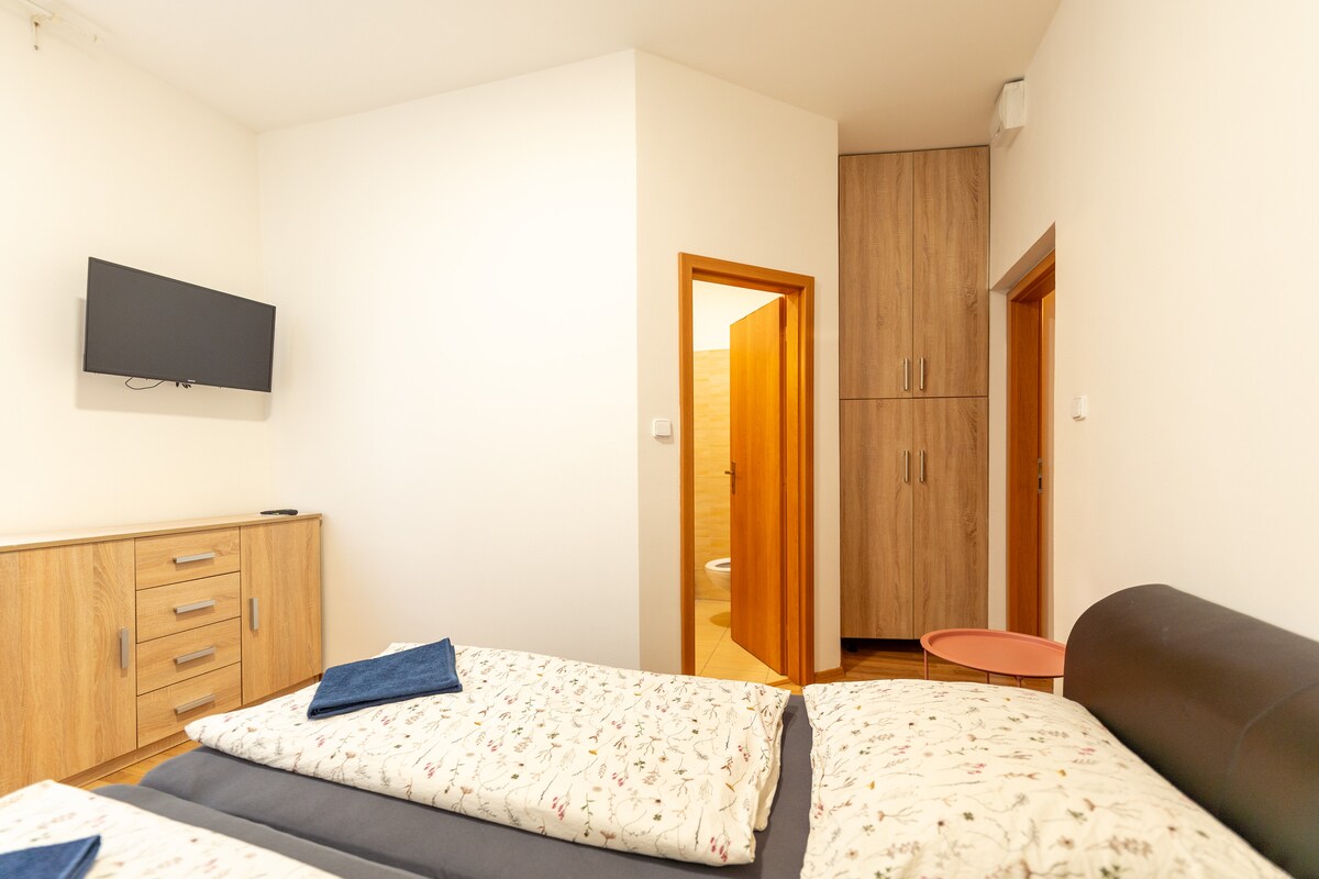 Phòng đôi thoải mái với phòng tắm riêng với vòi sen và nhà vệ sinh. Phòng có thể được mở rộng bằng một phòng riêng khác với TV riêng + 2 giường phụ (phụ phí 500,-CZK/người/đêm). Các tiện nghi của phòng bao gồm TV LCD lớn, tủ lạnh mini, cà phê và ấm trà. Phòng tắm có máy sấy tóc và đồ vệ sinh cá nhân. Đã bao gồm Wi-fi và bữa sáng.