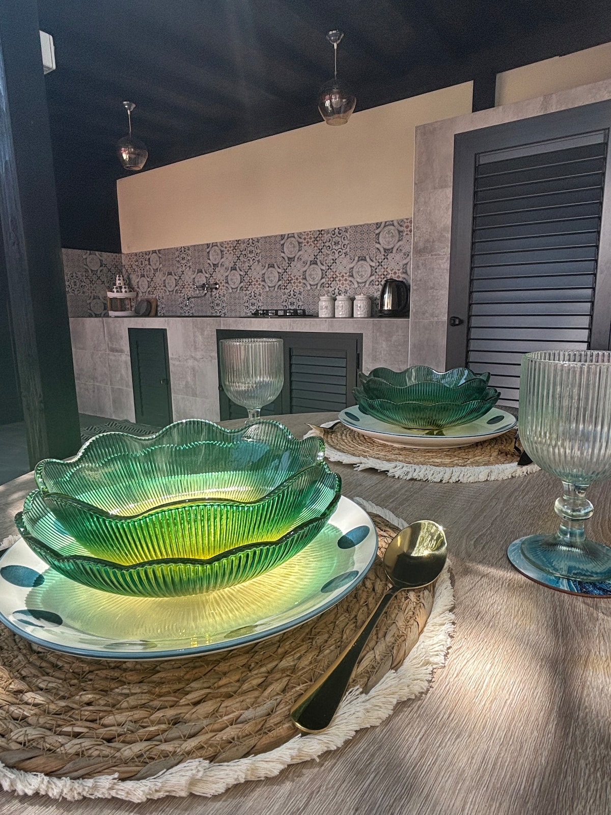 Căn hộ này nằm trong một ngôi nhà đá được cách nhiệt tốt nên rất thoải mái khi ở. Phía trước căn hộ là sân thượng, sân rộng cho một góc riêng tư và nhiều cây xanh tạo nên một không gian thoải mái bên ngoài căn hộ. Ngoài ra còn có một lò nướng để chuẩn bị bữa ăn.