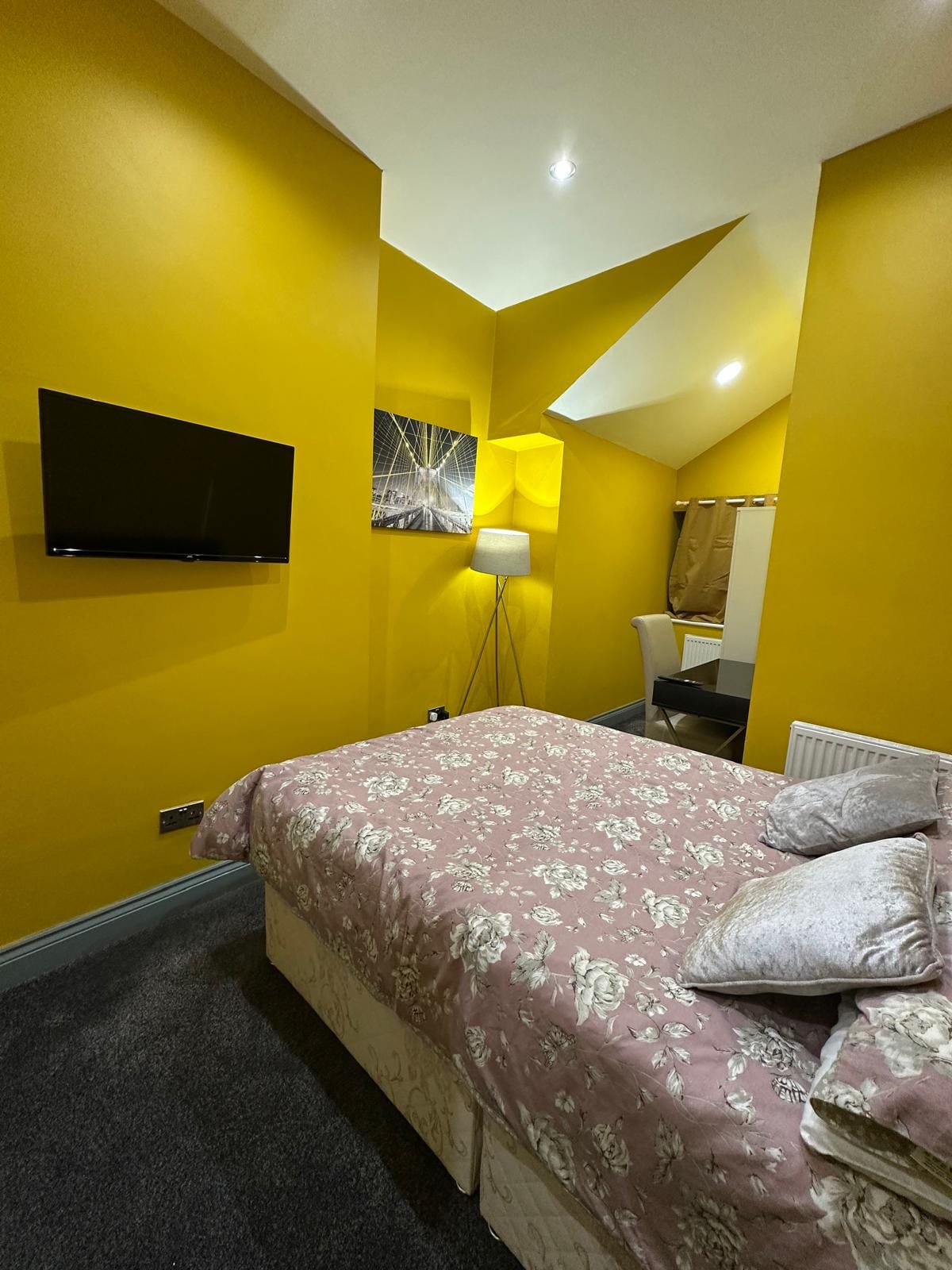Một ngôi nhà tuyệt vời với tầm nhìn đáng yêu ra Peak District. Phòng ngủ được trang trí trang nhã với giường đôi thoải mái, TV, tiện nghi pha trà và cà phê và bàn trang điểm/không gian làm việc. Bạn cũng sẽ có sự sang trọng của phòng tắm đầy đủ riêng với đồ vệ sinh cá nhân miễn phí. Bạn được hoan nghênh sử dụng nhà bếp đến 11:30 tối. Chỗ đỗ xe an toàn miễn phí. Trạm xe điện địa phương chỉ cách 3 phút đi bộ đưa bạn vào trung tâm thành phố trong khoảng 20 phút và đấu trường Etihad/Co-op trong 10 phút.