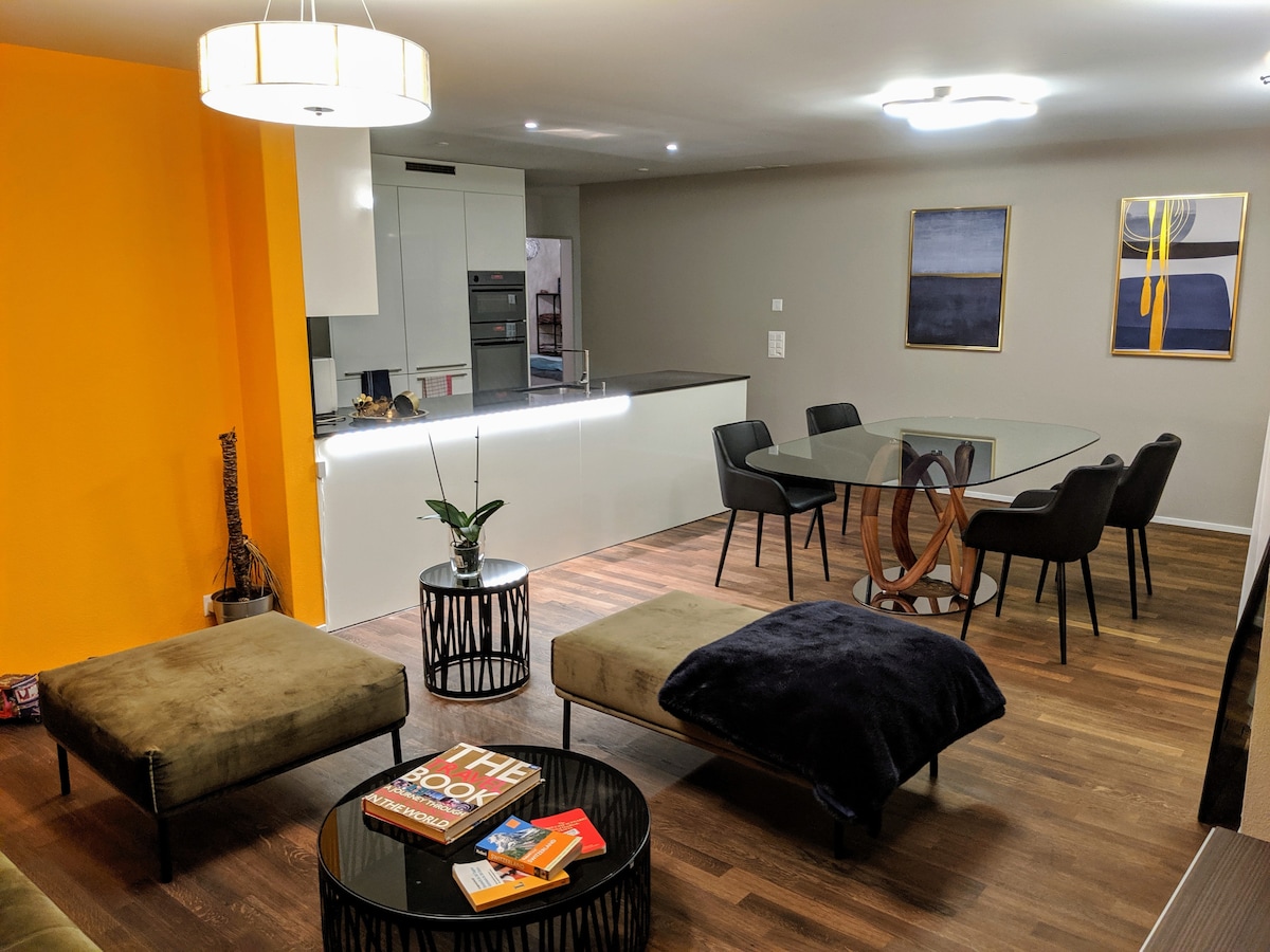 Luxuriös gestaltete Wohnung im Herzen von Glattbrugg, gut angebunden an die Autobahn und das öffentliche Verkehrsnetz der Stadt und des Flughafens (Obwohl es nur 5 Autominuten vom Flughafen entfernt ist, ist die Schalldämmung der Wohnung sehr gut und man hört den Lärm der Flugzeuge im Innenbereich nicht.) 3 Gehminuten von den beiden Bahnhöfen entfernt können Sie die Stadt und ihr Nachtleben erkunden, Supermärkte, Restaurants und Fitness befinden sich auch in der Nähe.