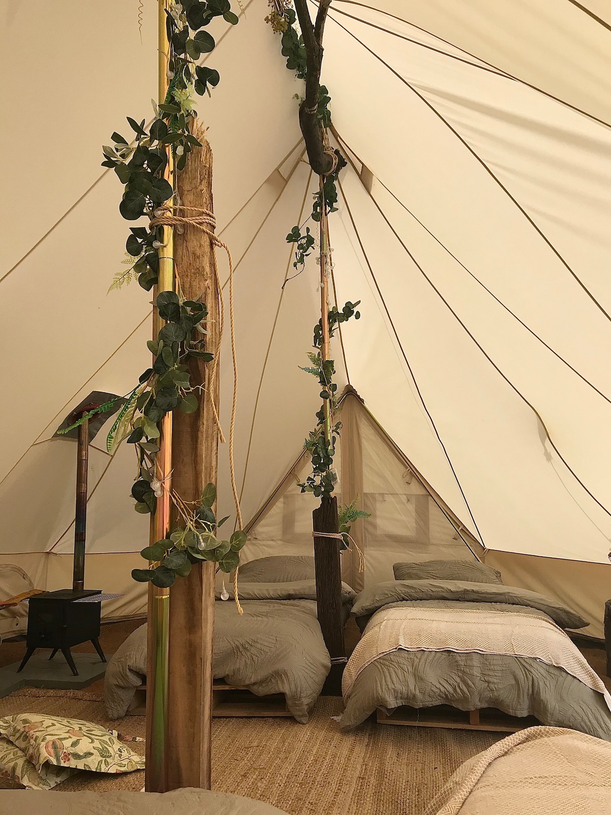 Lều chuông Chúng tôi có 2 lều chuông lớn. Họ cách nhau khoảng 10 mét. Lều chuông của chúng tôi có sàn gỗ đẹp và được trang bị đơn giản và hấp dẫn với thảm, đệm, bàn nhỏ, đèn pin gió và 2 đèn lồng, bunting và đèn cổ tích năng lượng mặt trời. Lều Bell phù hợp với 2 người và có nệm futon đôi với nệm hoàn toàn mới. Chúng tôi chỉ chấp nhận trẻ em từ 12 tuổi trở lên và không chấp nhận chó.