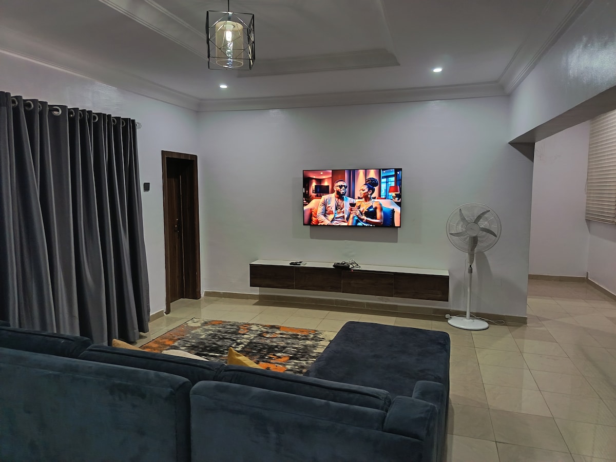 Trốn đến ốc đảo yên tĩnh của Olumide ngay trung tâm thành phố! Căn hộ 3 giường sang trọng của chúng tôi với Máy biến áp 33Kva đảm bảo cung cấp điện không bị gián đoạn. Thư giãn theo phong cách với các khu nghỉ dưỡng cỡ king sang trọng và hai phòng nghỉ dưỡng cỡ queen, mỗi nơi đều có phòng tắm khép kín, mang lại sự thoải mái tối đa. Duy trì kết nối với Wi-Fi nhanh, được hỗ trợ bởi máy phát điện dự phòng! và Netflix với TV thông minh 65 & 42"của chúng tôi, nhà bếp đầy đủ tiện nghi và ban công riêng. Hoàn hảo cho thời gian lưu trú dài hạn, gia đình và nhóm. Đặt ngay và thư giãn theo phong cách