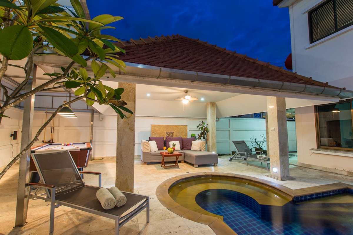 3 phòng ngủ 2 phòng tắm tuyệt vời và được phục vụ đầy đủ với dịch vụ giữ nhà, khăn tắm và ga trải giường. Hồ bơi riêng có Jacuzzi, với Pool Cabana được trang bị phòng chờ và bàn bi-a riêng. Tất cả đều nằm thuận tiện ở trung tâm bãi biển Patong. Một trong những nhà hồ bơi riêng có vị trí tốt nhất ở Patong. Có, hồ bơi trong Vườn và ngôi nhà là riêng tư và chỉ dành cho bạn. Bạn sẽ không dùng chung hồ bơi, vườn hoặc nhà với bất kỳ ai khác. Trong vòng vài phút từ bãi biển, khu mua sắm và khu vực sinh hoạt chính về đêm.