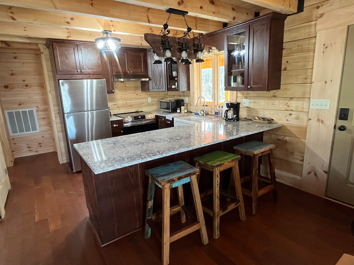 This Scandinavian-inspired cabin provides a serene retreat nestled in the trees, ideal for couples and solo getaways. Enjoy relaxing in the barrel steam sauna, cozy up to a fire, and explore forest hikes just minutes down the road. Perfectly located nearby all that the Shenandoah Valley has to offer, including Shenandoah National Park, George Washington National Forest, wineries, water adventures, and charming local towns. Welcome to Big Meadows @ Roaring Run Cabins.