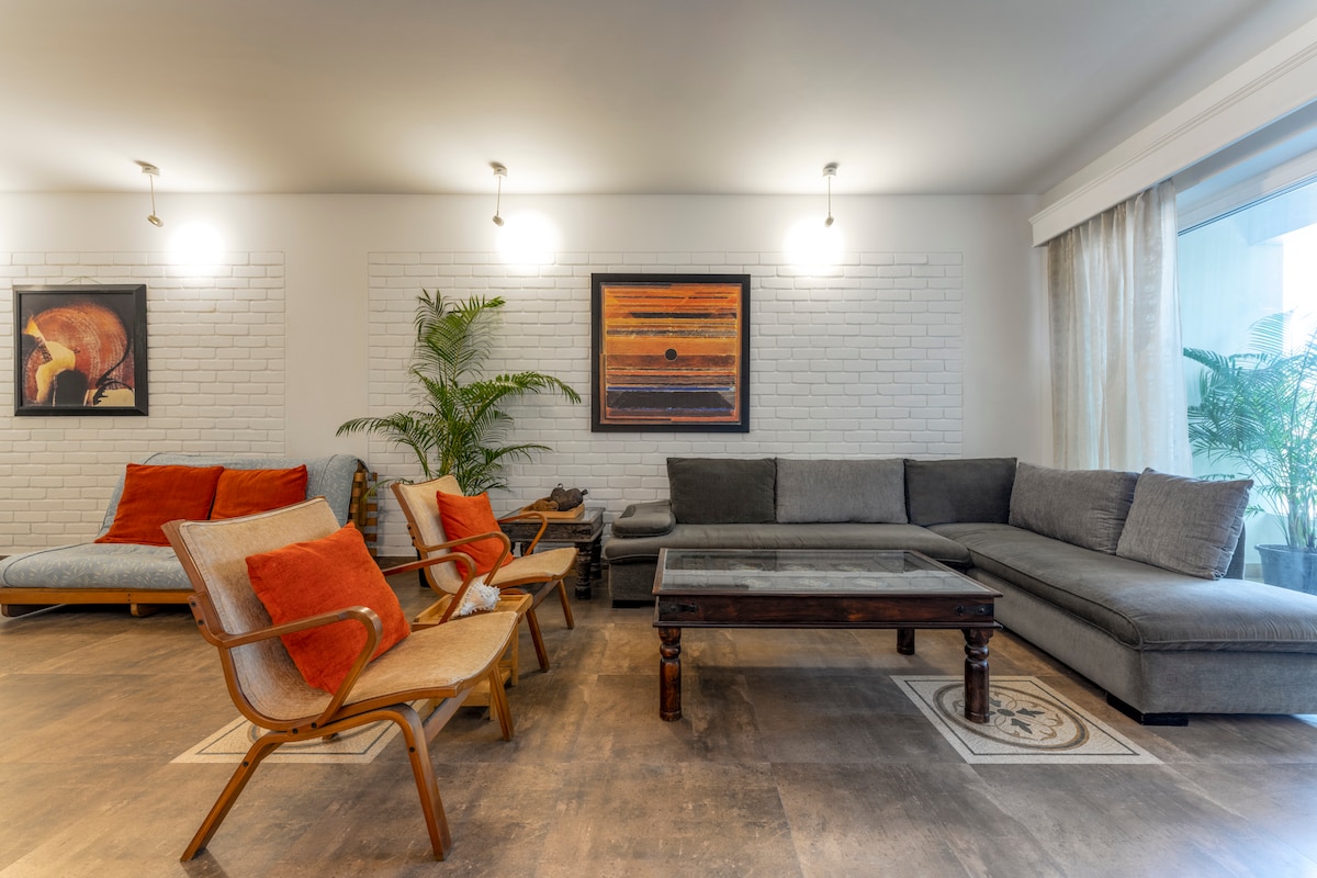 Unwind at our lovingly designed studio apartment with a mezzanine. Our home with high ceiling, floating staircase, hanging plants is designed for a charming feel. Enjoy your coffee with a beautiful view of sunrise over the mountain. The house is located in a residential society, guarded by security 24*7 so you feel safe at our home. We provide our guests with everything from linen, to toileteries, shaving kits, towel slippers, snacks for midnight cravings, and alot more.
