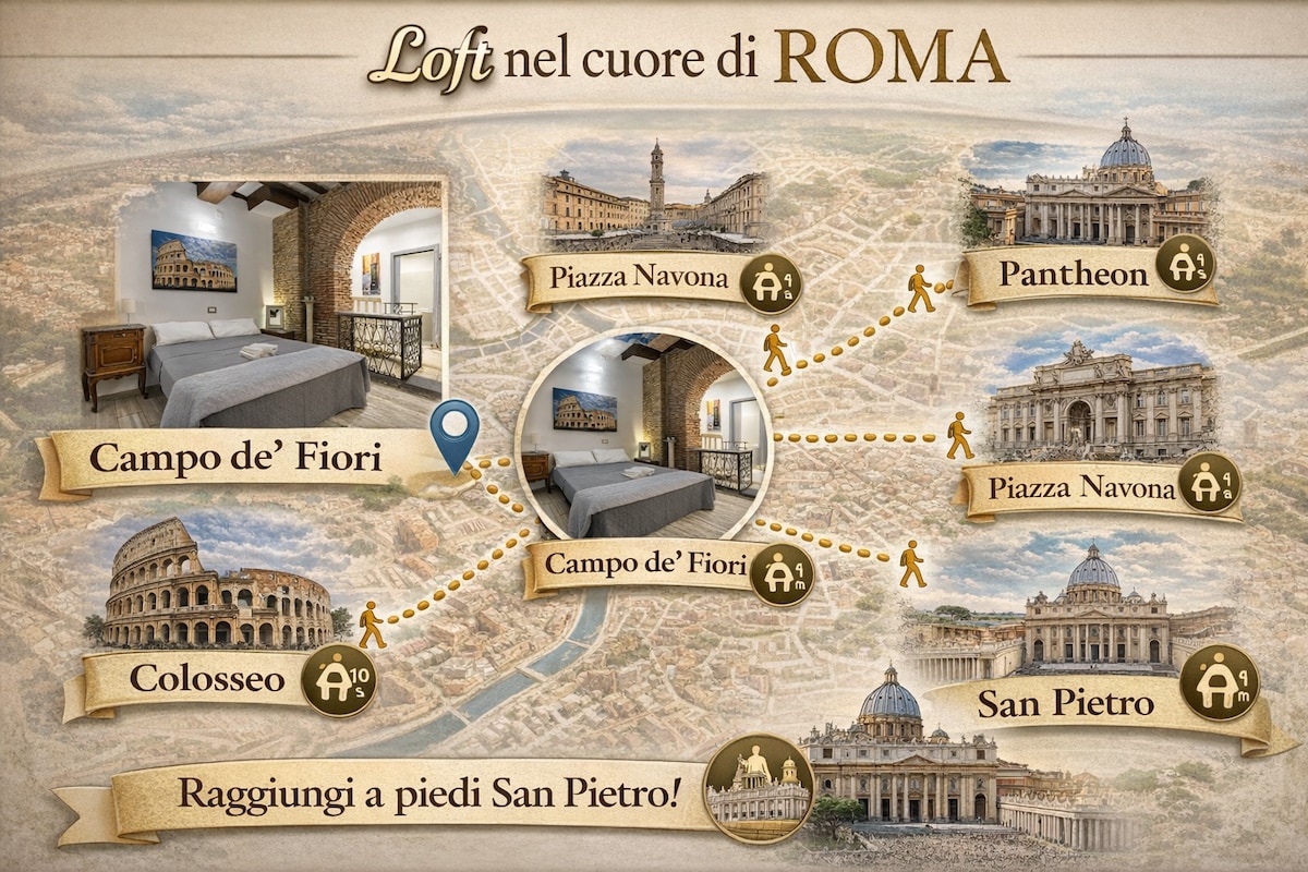 Căn hộ ấm cúng, thoải mái và hoàn hảo nằm ngay trung tâm lịch sử Campo dei Fiori, khu phố đẹp như tranh vẽ và quyến rũ chỉ cách Piazza Navona 2 phút và cách Trastevere 5 phút. Wi-fi không tính phí phòng (sử dụng các ứng dụng yêu thích của bạn) QUAN TRỌNG: Địa điểm ở tầng 4 không có thang máy. Quang cảnh ngoạn mục độc đáo và khó quên từ ban công của căn phòng. Các cặp vợ chồng, những người phiêu lưu một mình, những người đi công tác và các gia đình. ĐIỀU HÒA KHÔNG KHÍ