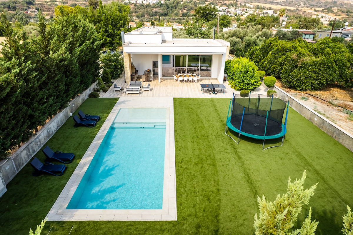 Biệt thự 3 phòng ngủ có trần nhà thờ và hồ bơi ngoài trời, vị trí lý tưởng với tầm nhìn 180° tuyệt đẹp ra chân núi Troodos và Địa Trung Hải. Ngủ thoải mái sáu người. Tận hưởng ánh nắng mặt trời trong sự riêng tư của khu vườn lớn của bạn. Bãi biển, sân golf, quán rượu làng quyến rũ gần đó, cũng như một loạt các hoạt động khác ở khoảng cách ngắn. Phù hợp với cả kỳ ở mùa hè và mùa đông.