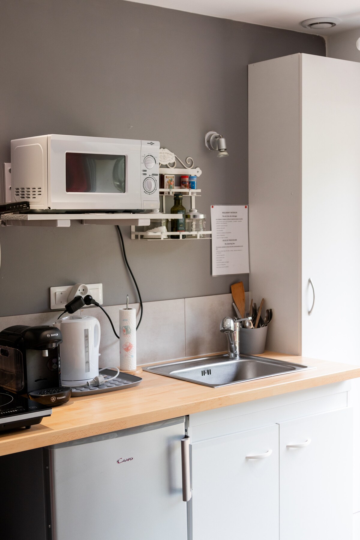 chỗ ở có bếp (tủ lạnh, bếp nấu, lò vi sóng, máy pha cà phê senseo, ấm đun nước, máy nướng bánh mì. khu vực ăn uống trong phòng khách và khu vực ngủ: bz cho 2 trong 140 cm , phòng tắm với lối vào phòng ngủ wc lên tầng bằng cầu thang 12 bậc. giường 140 cho 2 người - giường gấp cho em bé với nệm, ghế cao, bãi đỗ xe an toàn và preau cho xe máy, làng với các tiện nghi (tiệm bánh, cửa hàng tạp hóa, bưu điện, người phục vụ) siêu thị 3 km.