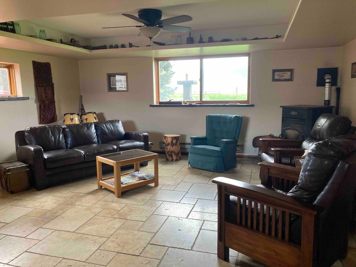 Chúng tôi cung cấp một căn hộ cấp vườn riêng rộng 1200 ft vuông hoàn chỉnh với nhà bếp, phòng khách, phòng tắm, hai phòng ngủ riêng, cửa sổ ngắm cảnh lớn và lối vào riêng. Corrals có sẵn cho thợ săn. Gia đình chúng tôi sống trên lầu. Hãy đến thu thập trứng gà tươi cho bữa sáng, vuốt ve chó của chúng tôi hoặc ngồi quanh lò sưởi vào buổi tối. 1 giờ lái xe đến lối vào phía Đông của Yellowstone. Tận hưởng khung cảnh núi non tuyệt đẹp, BBQ, hố lửa và hương vị của cuộc sống trang trại gia đình nhỏ.